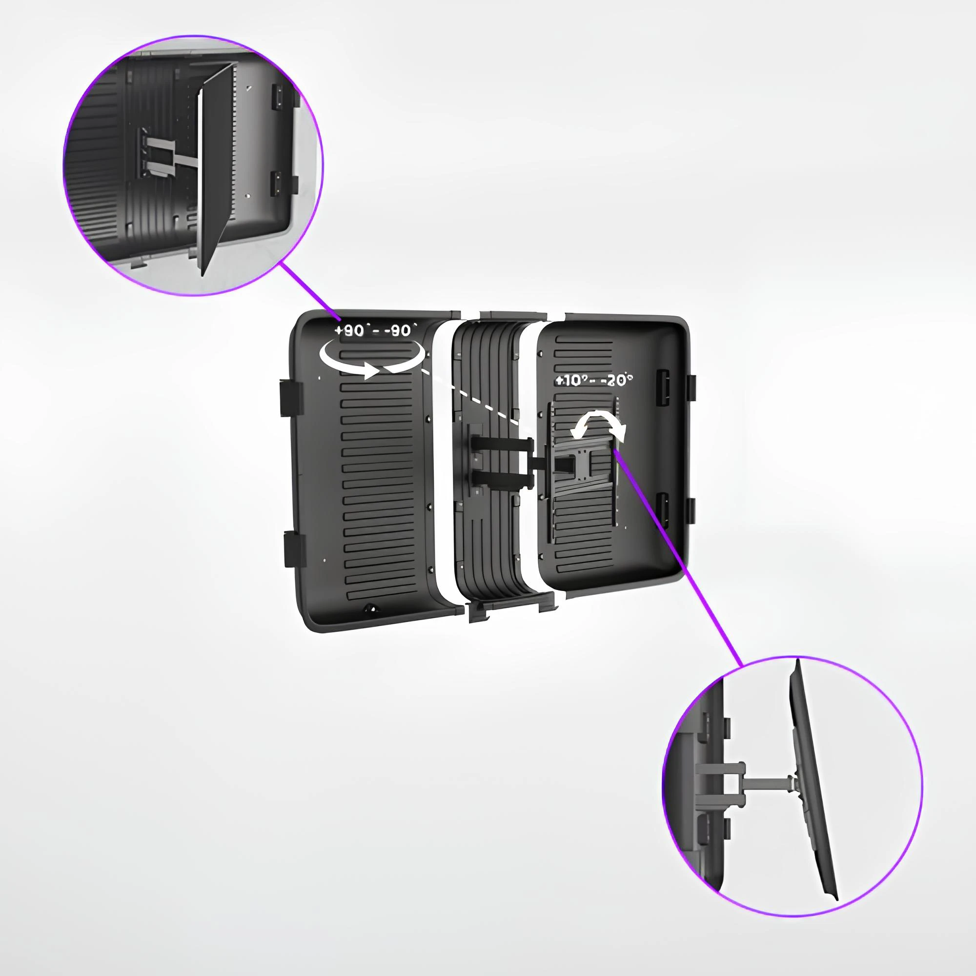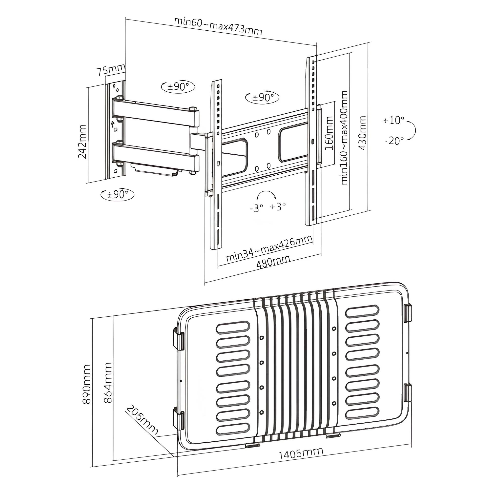 Obudowa na telewizor Spacetronik SPE-T20_55 pasuje do większości telewizorów w przedziale od 32 do 55 cali. Dodatkowo jest ona zgodna ze standardem VESA 200x200, 300x200, 400x200, 300x300, 400x300, 400x400. By zapewnić Ci pełną swobodę z korzystania z urządzenia, ekran nachyla się w zakresie +10~-20°. Możesz go również obracać o 90° w obu kierunkach. Poziom natomiast ustawisz w przedziale od +3 do -3°.
