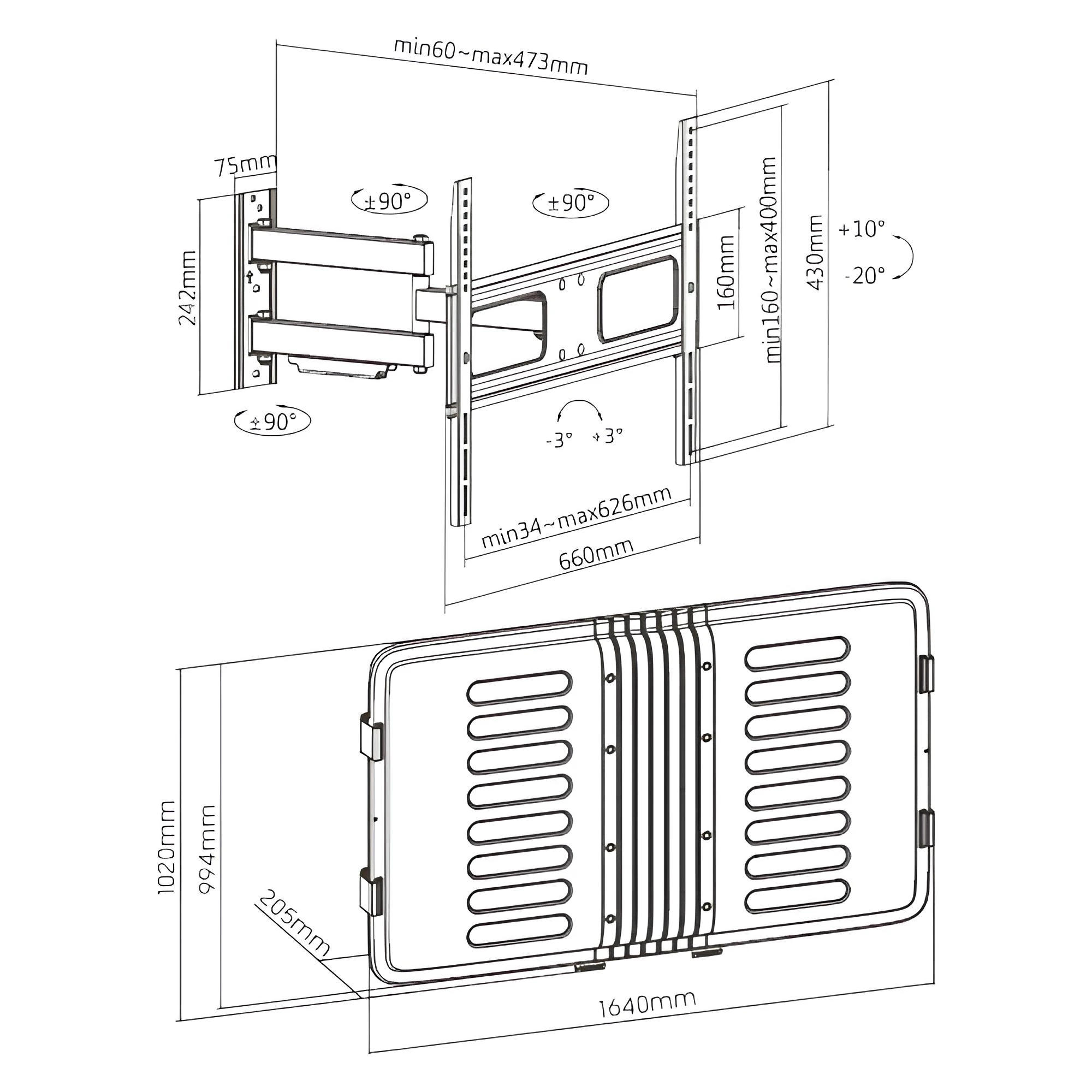 Obudowa na telewizor Spacetronik SPE-T20_65 pasuje do większości telewizorów w przedziale od 43 do 65 cali. Dodatkowo jest ona zgodna ze standardem VESA 200x200, 300x200, 400x200, 300x300, 400x300, 400x400, 600x400. By zapewnić Ci pełną swobodę z korzystania z urządzenia, ekran nachyla się w zakresie +10~-20°. Możesz go również obracać o 90° w obu kierunkach. Poziom natomiast ustawisz w przedziale od +3 do -3°.