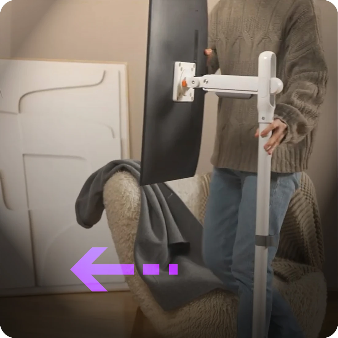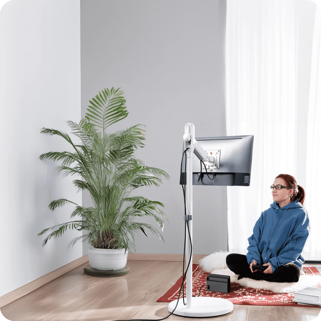 Trzeba się spodziewać, że monitor powieszony na uchwycie SPE-T01W będzie cały czas znajdował się w zmieniających się warunkach świetlnych. To wszystko z uwagi na dużą mobilność, jaką zapewniają jego ukryte w podstawie kółka. Dlatego też ramię uchwytu pozwala Ci na pełną kontrolę ustawienia monitora. Zyskujesz tę możliwość poprzez dostosowanie jego pozycji o 90 stopni w każdym kierunku. Dzięki temu będziesz mógł zawsze dowolnie dopasować położenie ekranu. Dostosujesz je idealnie do aktualnie padającego na monitor światła.