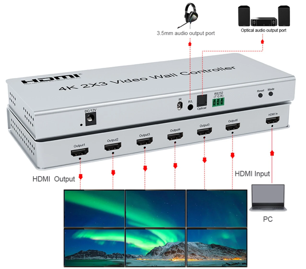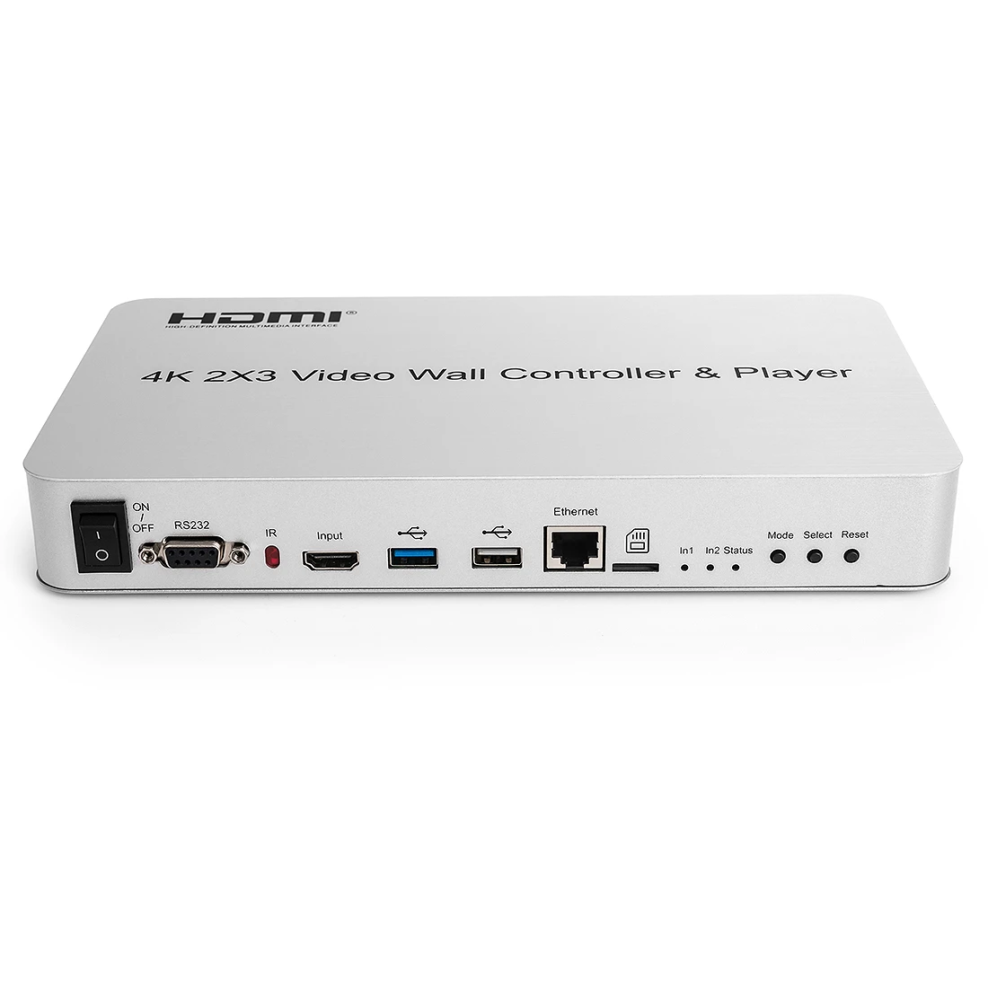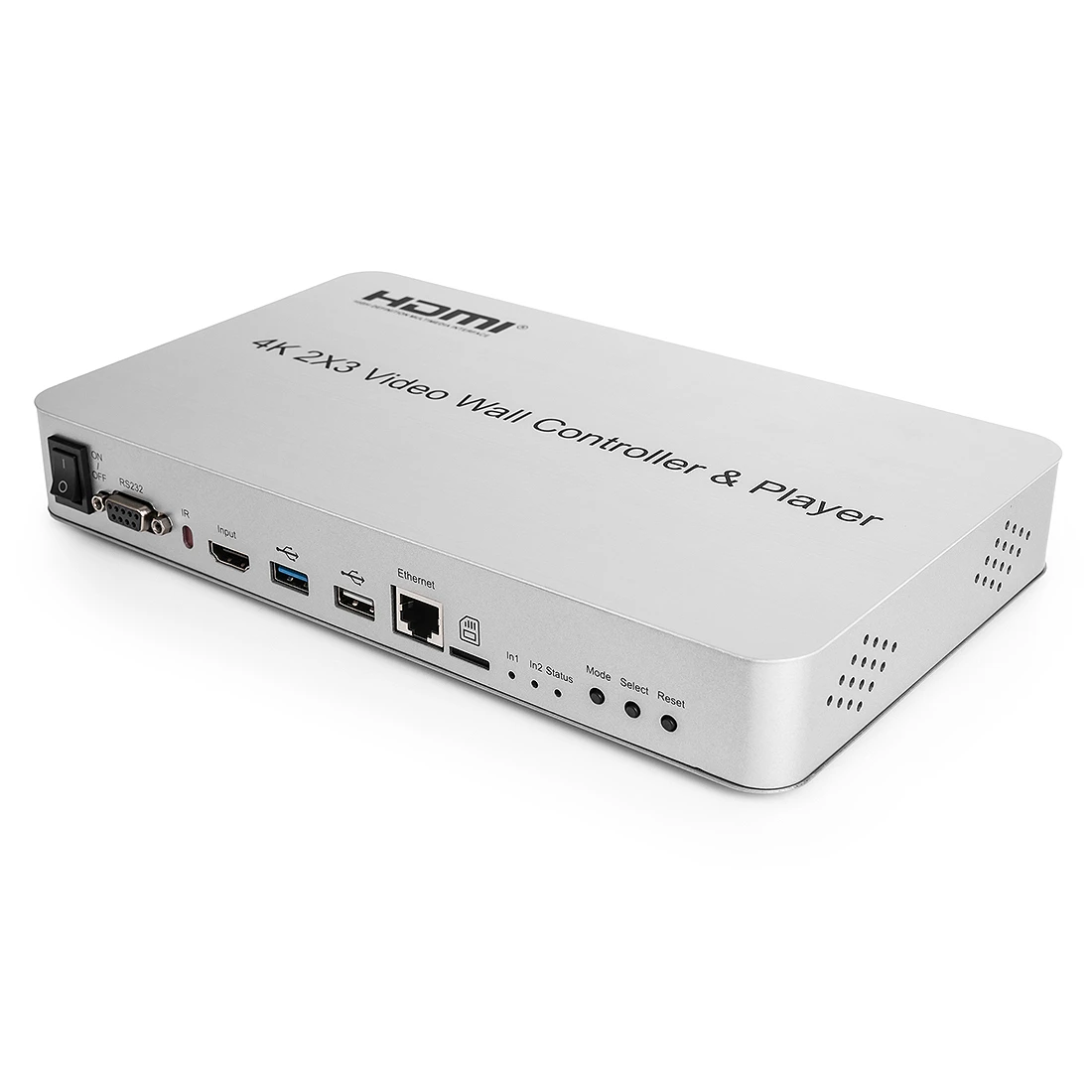 Kontroler ściany 2x3 pozwalający na przesyłanie sygnału Video z portu HDMI i wyświetlaniu na odbiornikach HDMI w różnych konfiguracjach. Pozwala na stworzenie dużego i dynamicznego obrazu tworząc ścianę z 6 odbiorników. Urządzenie obsługuje kable do 5m na wejściu i wyjściu oraz rozdzielczość 4K@30Hz.