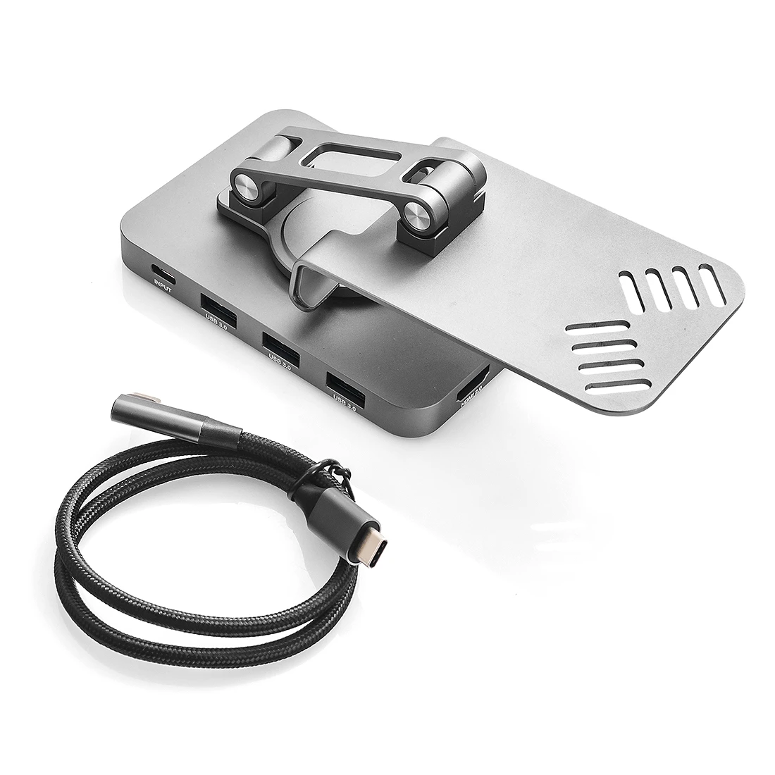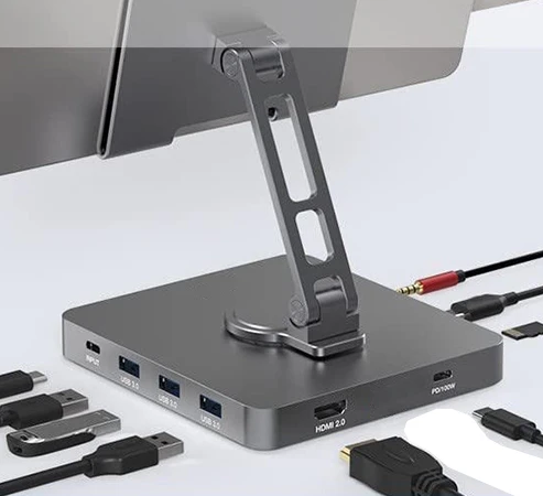 Podstawka pod laptop z USB-C, USB, HDMI, czytnikiem kart oraz AUX to praktyczne akcesorium, które pozwala na wygodniejsze i bardziej funkcjonalne korzystanie z telefonu. Jest to rodzaj stacji dokującej lub podstawki, którą można umieścić na biurku, stole lub gdziekolwiek zechcesz, aby rozszerzyć jego możliwości podłączania różnych urządzeń.