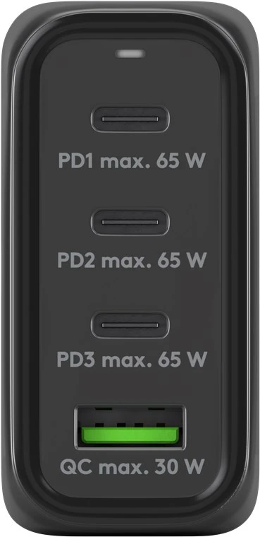 Ładowarka sieciowa obsługująca superszybkie ładowanie 68W i technologię Quick Charge oraz Power Delivery. Wyposażona w trzy porty USB-C oraz jeden standardowy USB. Ładowarka nadaje się do smartfonów, tabletów, kamer i innych urządzeń zasilanych akumulatorowo.