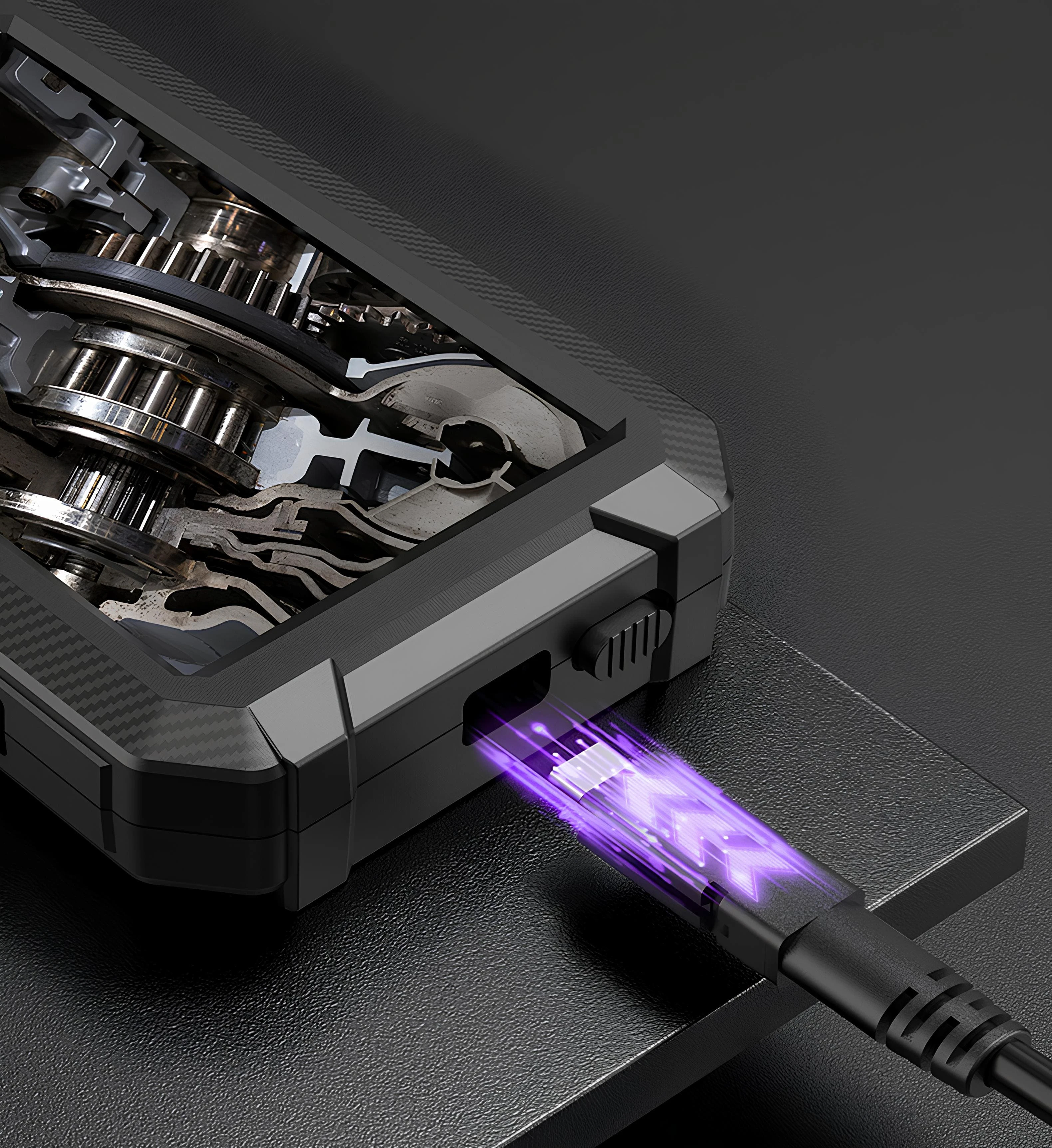 Bateria o pojemności 2000 mAh zapewnia pracę urządzenia przez około 3 godziny. Dzięki temu nie musisz obawiać się, że w trakcie pracy bateria nagle się rozładuje. Za pomocą dołączonego do zestawu kabla USB-C naładujesz urządzenie już w około 2,5h. Kabel ten zapewnia transfer danych o szybkości 40MB/s więc bez problemu i szybko zgrasz na komputer wszystkie zdjęcia i nagrania. Jednak nie tylko wytrzymała bateria sprawia, że Endoskop SPU-E02-0100 nadaje się idealnie do pracy w niekorzystnych warunkach. Wodoodporność na poziomie IP67 zagwarantuje Ci bezpieczeństwo w warunkach mokrych, więc możesz bez najmniejszego problemu wykorzystywać urządzenie, chociażby do inspekcji rur czy też maszyn.