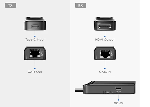 Wystarczy podłączyć nadajnik USB-C do źródła, np. tabletu lub laptopa, odbiornik podłączyć do wyświetlacza, np. telewizora czy monitora. Transmiter oraz nadajnik trzeba ze sobą podłączyć kablem LAN Cat6/6A/7. Odbiornik trzeba dodatkowo zasilić za pomocą dołączonego kabla USB.
