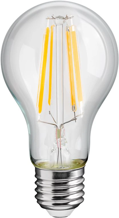 Tradycyjna żarówka LED-owa z tzw. "dużym gwintem" E27 o mocy 11 watów. Dzięki zastosowaniu filamentu (imitacji żarnika wolframowego) za światło odpowiada pasek ledowy wyglądający jak włókno w tradycyjnej żarówce. Żarówka emituje światło o temperaturze barwowej na poziomie 2700 K co przekłada się na barwę zwaną "białe ciepłe" (lekko wpadające w żółte). Stosowanie żarówek LED zamiast tradycyjnych przekłada się na mniejsze zużycie energii elektrycznej i dłuższą żywotność (do 15000 godzin). Rozwiązania LED nie nagrzewają się, dzięki czemu nie stwarzają zagrożenia gdy użytkowane są w miejscach, w których mogą dotknąć je małe dzieci.