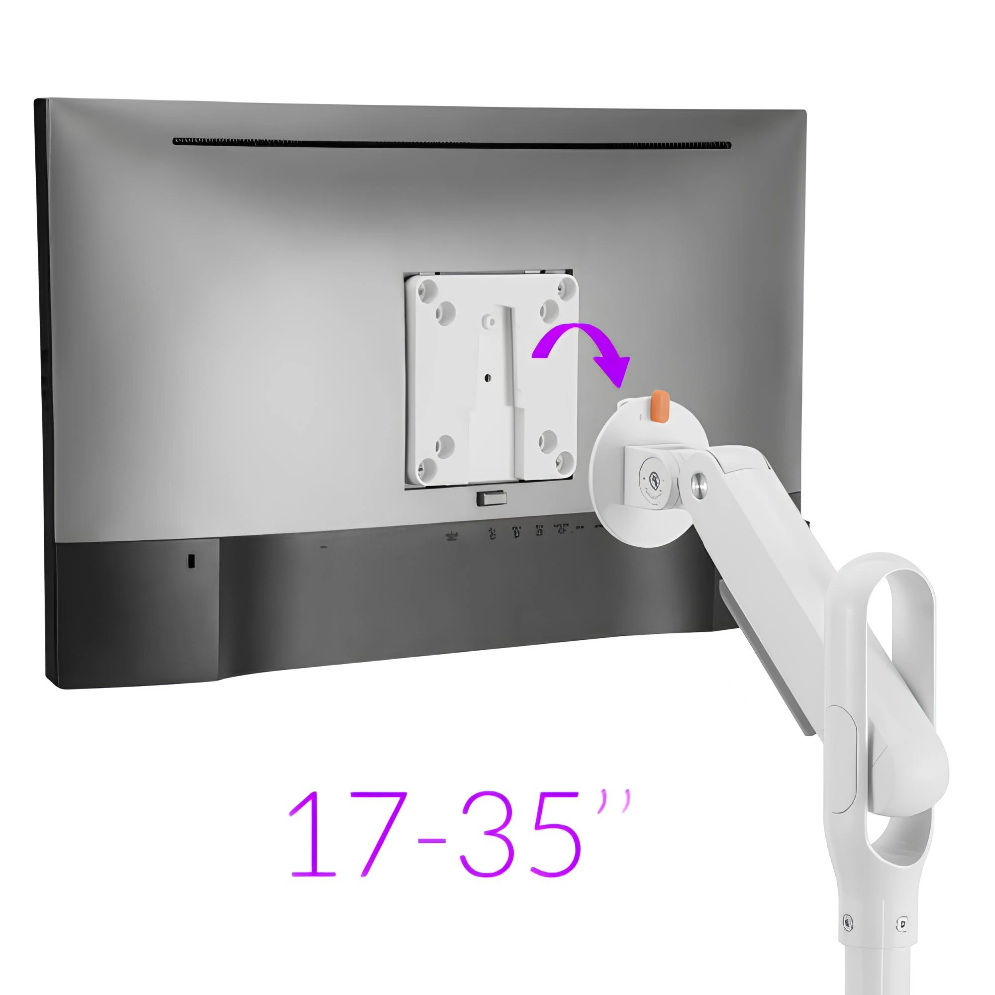 Podstawa statywu wynosi 1140 mm. Dodatkowo ramię ma regulowana wysokość od 180 do 218 mm. Sprawia to, że będziesz mógł w wygodny sposób korzystać z monitora. Nie musisz bać się o to, że monitor będzie zawieszony za wysoko albo za nisko. Co więcej, statyw jest zgodny ze standardem VESA 75×75,100×100. Sam wieszak natomiast został zbudowany w taki sposób, by zapewnić Ci prostą i błyskawiczną instalację monitora. Dzięki temu wszystkiemu na uchwycie SPE-T01W bez problemu zamontujesz monitory o rozmiarze 17-35''. Jednak, by zapewnić Ci nie tylko funkcjonalność, statyw do monitora zadba o dostarczenie odpowiednich bodźców estetycznych. Delikatne białe malowanie, organizer kabli. Te cechy dbają o to, byś niezależnie od tego, gdzie się znajdziesz, dysponował urządzeniem przyjemnym dla oka. Produktem, który pasuje do Twojej przestrzeni.