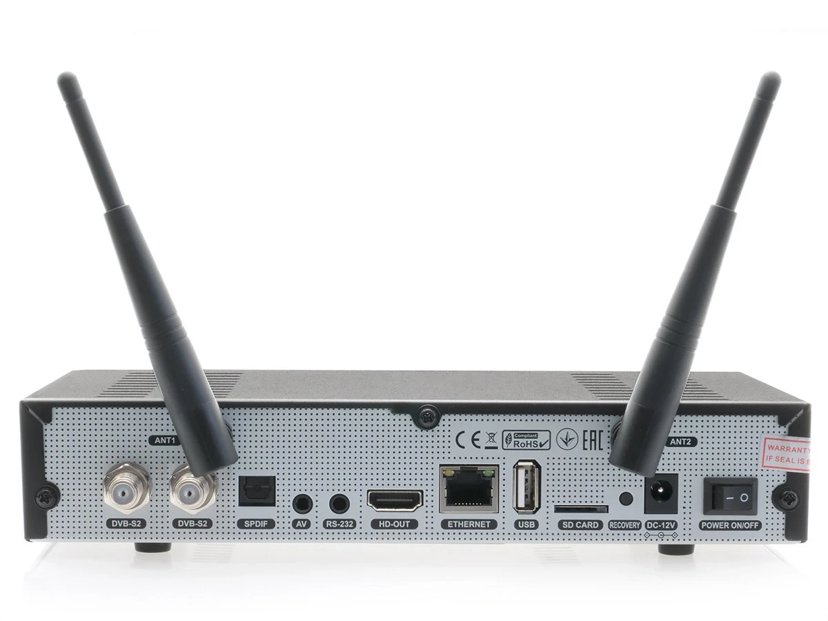 Odbiornik jest wyposażony w procesor 4K H.265 HEVC UHD, 8 GB eMMC Flash/1 GB DDR DRAM, gniazdo M.2 SSD, HDMI i USB z funkcją PVR, LAN, Wi-Fi, AV przez RCA