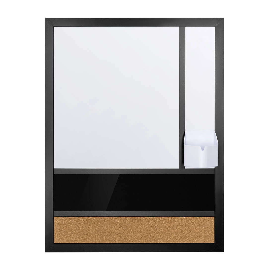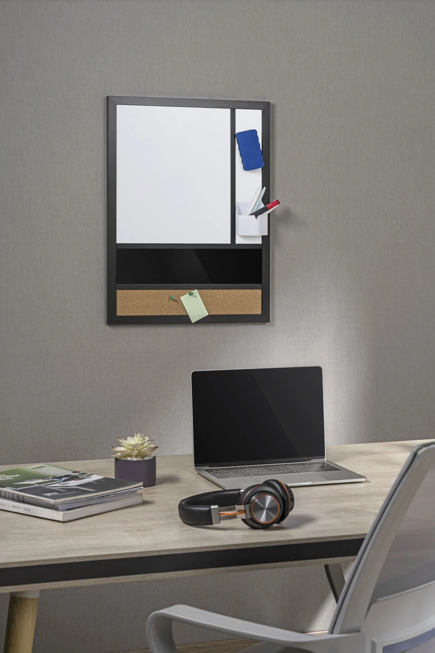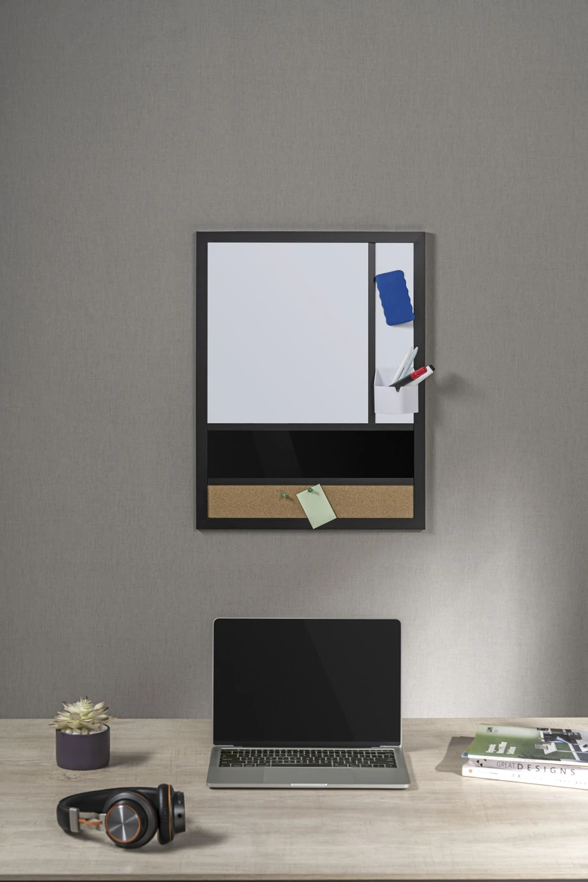 Dzięki przemyślanej kombinacji funkcji suchościeralnej, korkowej i przechowywania, ta tablica staje się kompleksowym narzędziem organizacyjnym. Powierzchnia suchościeralna umożliwia błyskawiczne notowanie i wymazywanie pomysłów, natomiast korkowa część umożliwia przypinanie notatek, kartek i istotnych dokumentów, co dodatkowo podnosi efektywność codziennych obowiązków. Dodatkowo, praktyczna przestrzeń do przechowywania pisaków i drobiazgów na tablicy pozwala utrzymać niezbędne akcesoria w zasięgu ręki, co przekłada się na usprawnienie codziennych obowiązków. W ten sposób, jedna tablica spełnia trzy kluczowe funkcje, tworząc zorganizowane i inspirujące miejsce do pracy czy nauki.
