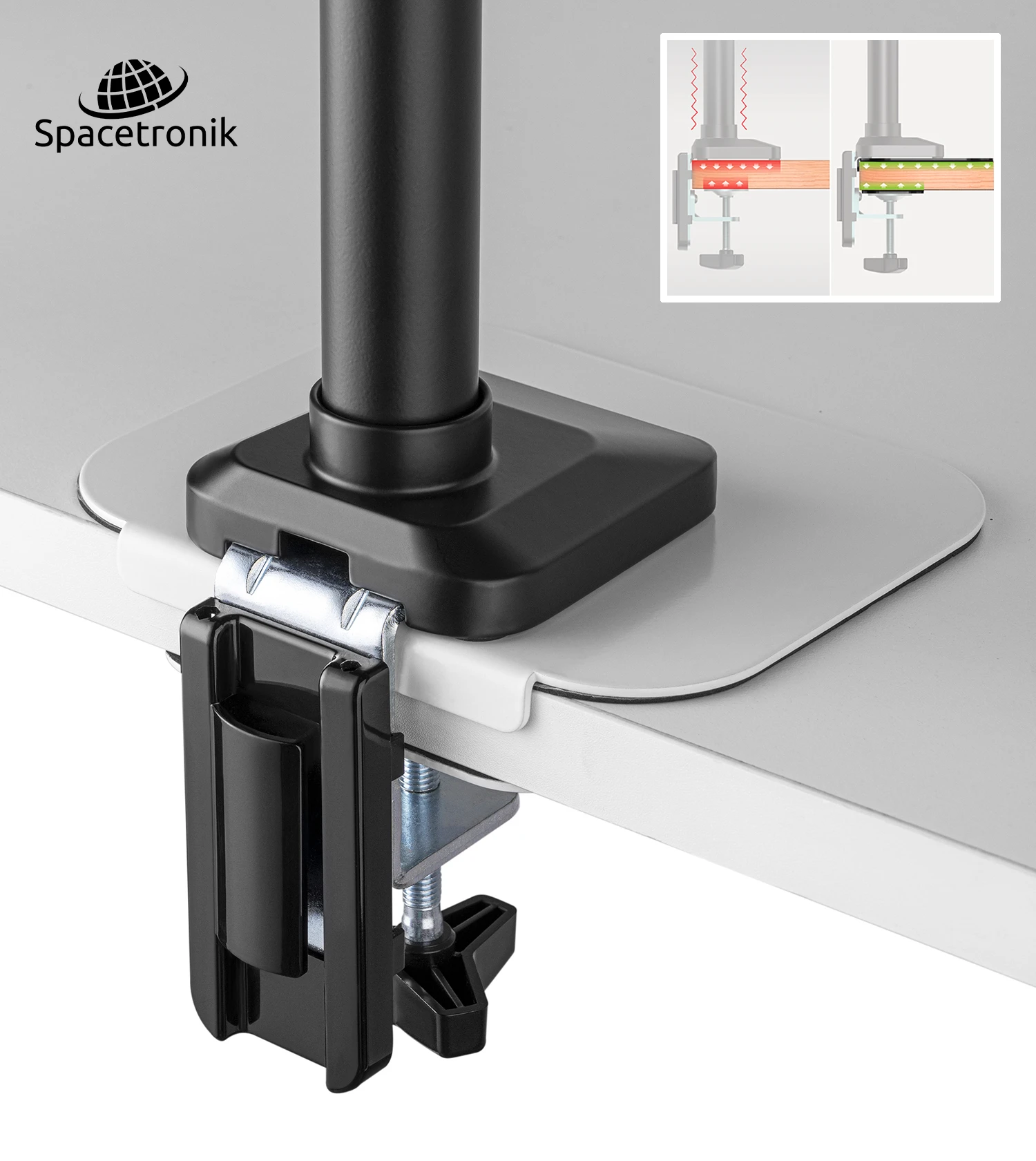 SPA-010 to idealne rozwiązanie dla osób, które mają problem z niestabilnym uchwytem lub obawiają się o uszkodzenie lub zarysowanie blatu. Podkładka równomiernie rozkłada ciężar uchwytu wraz ze sprzętem oraz posiada silikonowe podbicie, dzięki któremu uchwyt stoi stabilnie, a blat nie jest narażony na żadne uszkodzenia. Możliwe jest zamontowanie podkładki zarówno do uchwytu na zacisk, jak i do montażu przelotowego dzięki otworowi na śrubę.