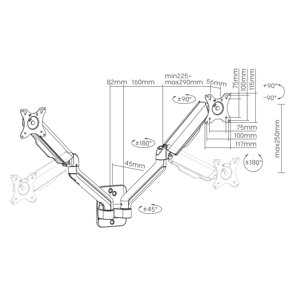 Ramię do monitorów Spacetronik oferuje pełną swobodę konfiguracji. Możliwość pochylenia w zakresie +90°~-90°, a zakres obrotu oraz rotacji ekranu to również +90°~-90°. Maksymalne wydłużenie ramienia to 450 mm, co umożliwia optymalne dostosowanie monitora do indywidualnych potrzeb użytkownika.