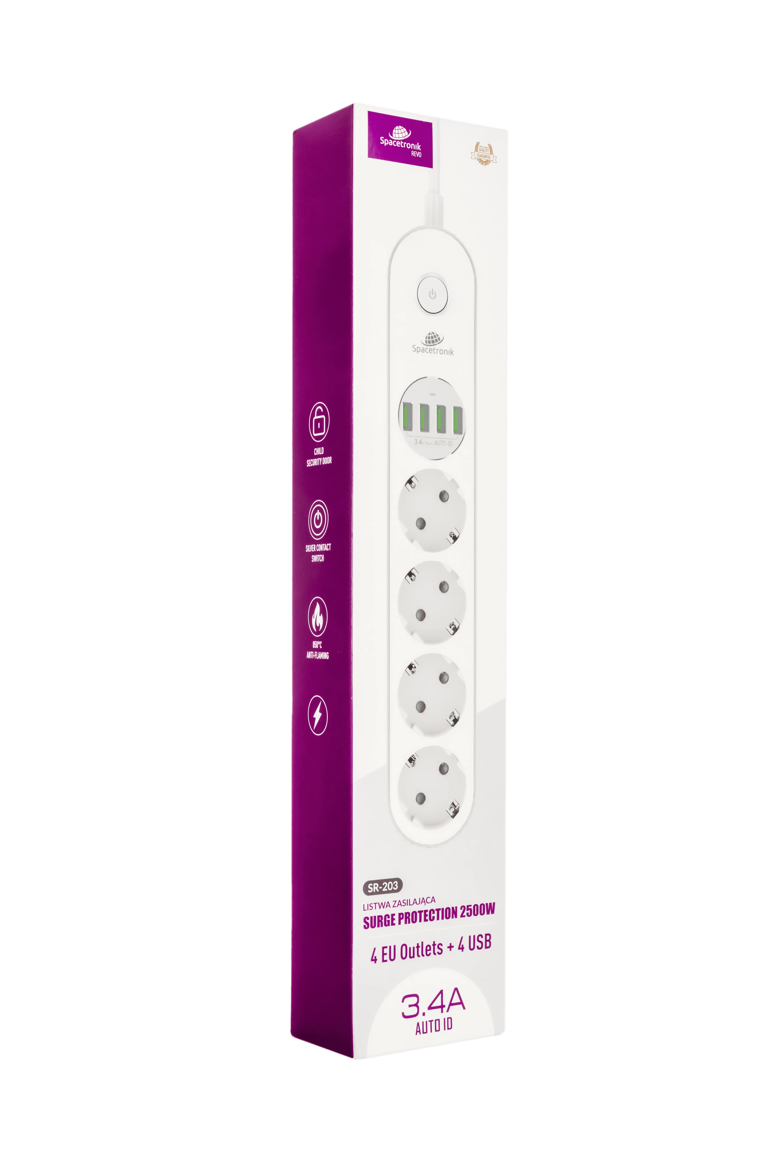 Świat otaczającej nas technologii sprawia, że każdego dnia korzystamy z wielu urządzeń elektronicznych. Potrzebują one oczywiście dostępu do prądu. Warto, więc wyposażyć się w sprzęt, który im to zapewni. Przykładem takiego produktu jest listwa zasilająca Spacetronik SR-203. Jest ona wyposażona w 4 porty AC i 4 porty USB Auto-ID. Dzięki temu można do niej podłączyć większość popularnych urządzeń. Jednocześnie można, więc ładować 8 urządzeń. Ładowarka posiada również funkcje Quick Charge 2.0. Oznacza to, że urządzenie jest w stanie szybko i efektywnie naładować akumulatory o dużej pojemności. Listwa ma gruby kabel o długości 2m, a tylna ścianka posiada otwory do zawieszenia. Dzięki temu z łatwością umieścisz ją w każdym miejscu.