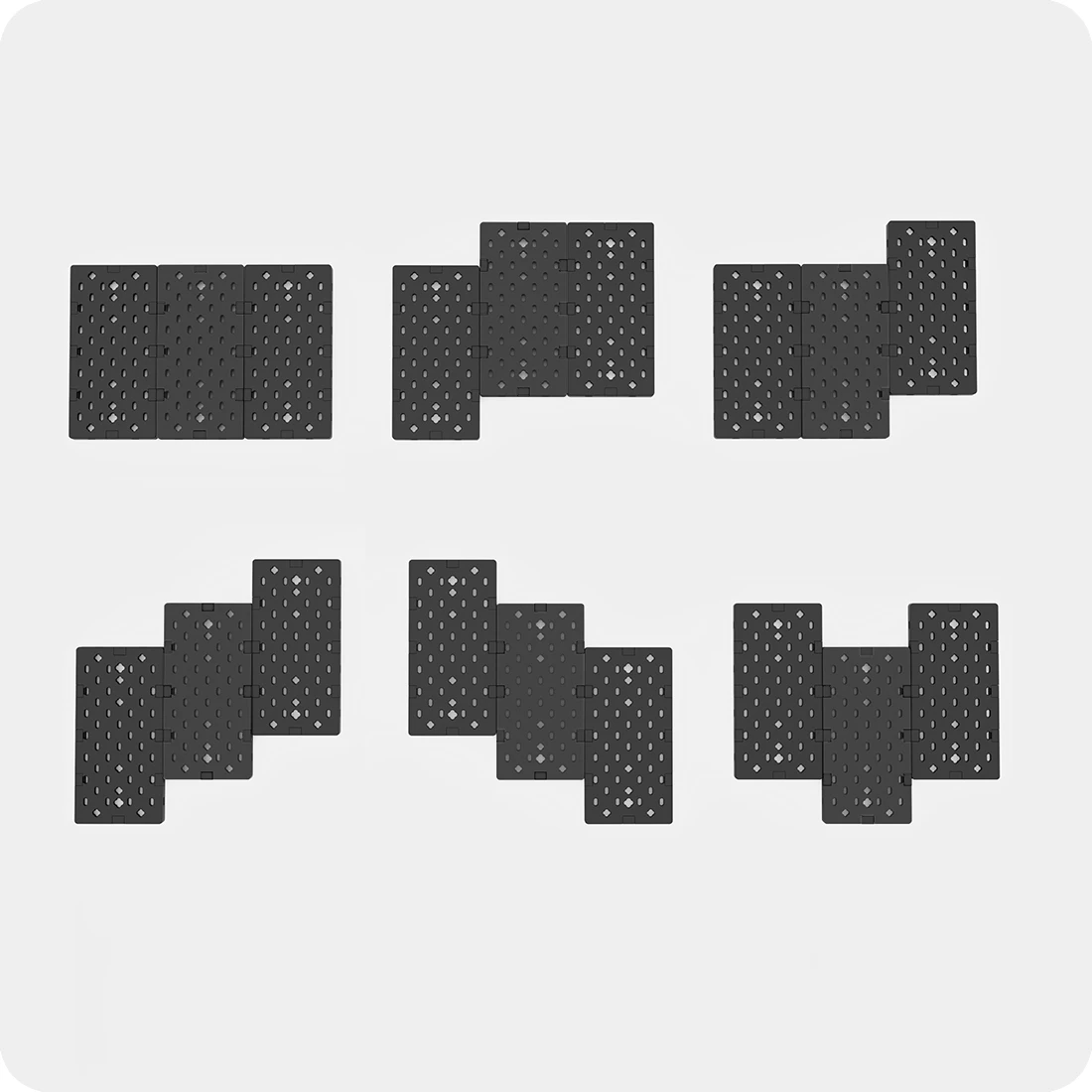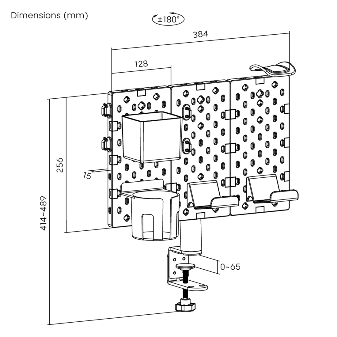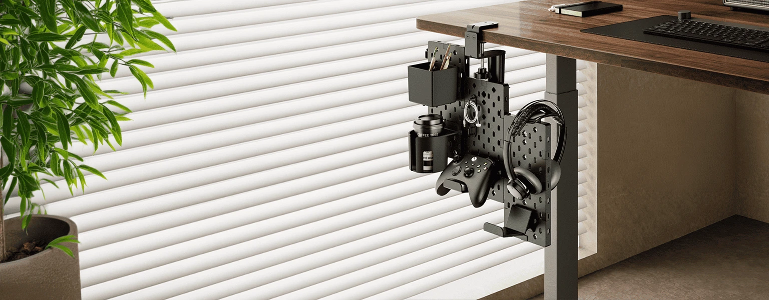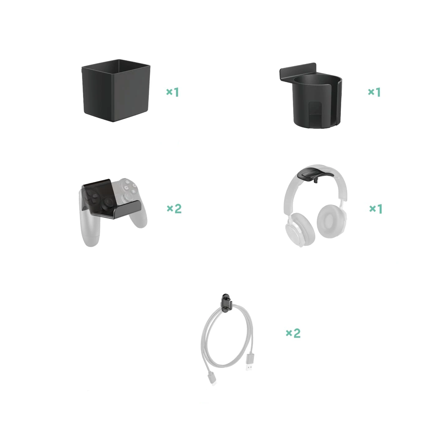 W zestawie oprócz 3 modułowych części perforowanych możesz znaleźć uchwyty na artykuły piśmiennicze, na kubek, na pady, uchwyt na słuchawki oraz uchwyty na kable. Jest to kompletny uchwyt biurkowy, dzięki któremu łatwo zorganizujesz akcesoria na biurku. To Ty decydujesz, w którym miejscu zamontujesz dany element i jak go wykorzystasz.