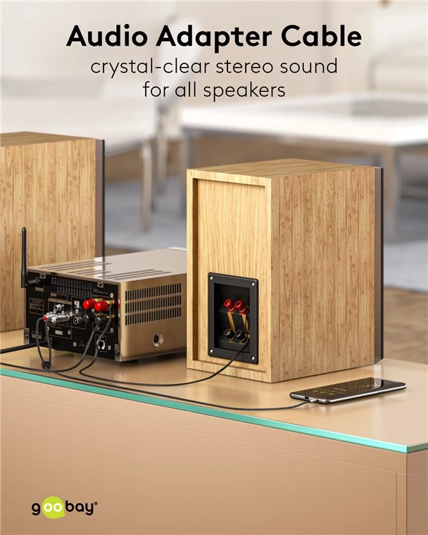 - Kabel audio do podłączenia smartfona, komputera lub zestawu kina domowego z gniazdem jack do urządzeń wyjściowych, takich jak głośniki, telewizor, wzmacniacz lub Soundbar ze złączami cinch