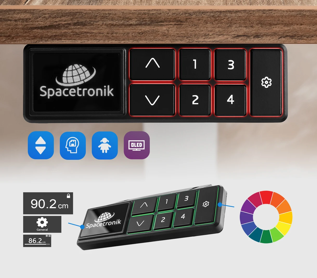 Stelaż elektrycznie regulowany Spacetronik SPE-231OW został wyposażony w kontroler z udogodnieniami. Dokonuj zmian, zapisuj ustawienia na czytelnym wyświetlaczu OLED. Reguluj wysokość za pomocą przycisków "góra" oraz "dół" i obserwuj aktualną pozycję na ekranie OLED. Zapisz do czterech wybranych ustawień wysokości i wracaj do nich w przyszłości. Biurko umożliwia blokadę kontrolera np. przed niepożądanym użyciem przez dzieci. Przestrzeń wokół przycisków jest podświetlania kilkoma kolorami naprzemiennie.