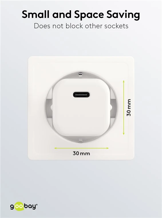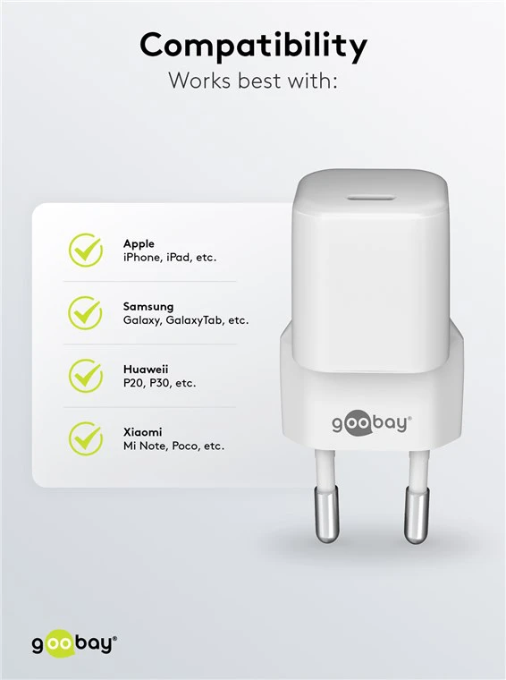 - Ładowarka USB-C nano firmy Goobay jest wyposażona w 1x port USB-C z funkcją Power Delivery,