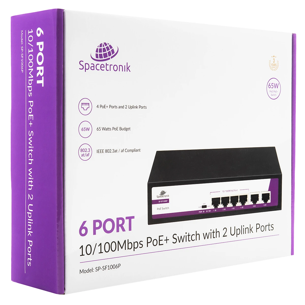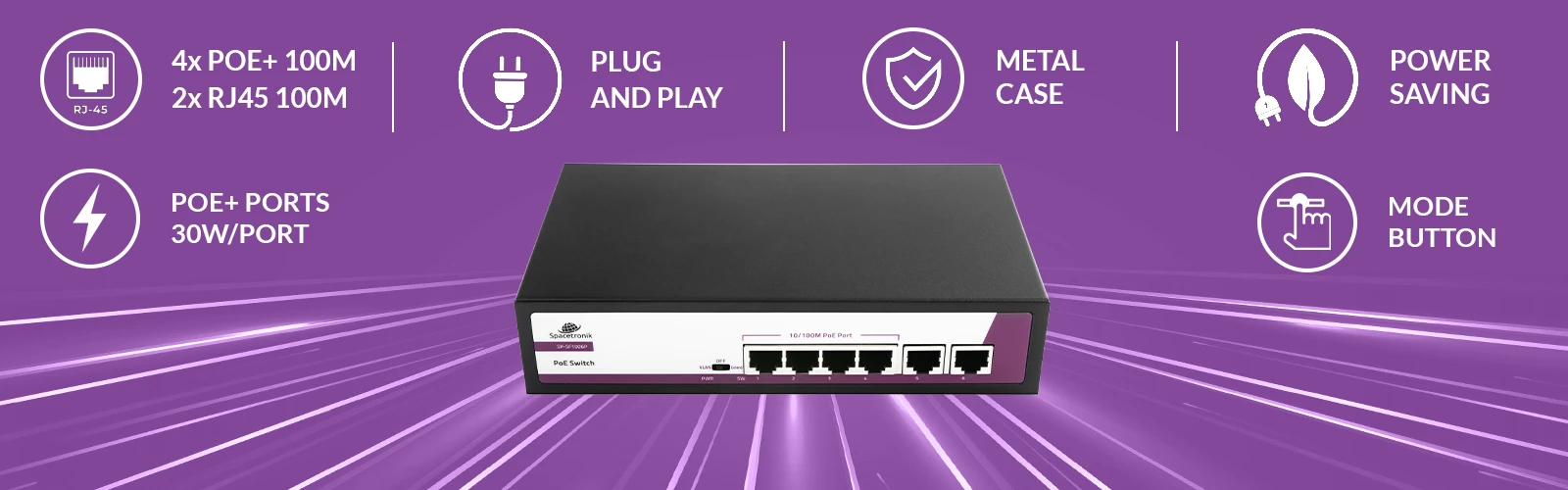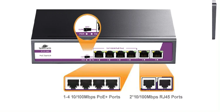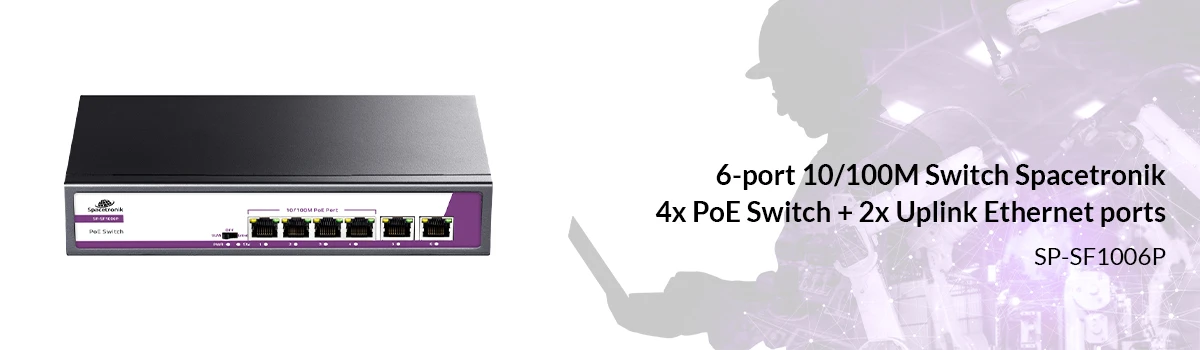 6 portowy SWITCH Spacetronik 4x port POE + 2x Uplink Ethernet port RJ45 SP-SF1006P 10/100Mbps 65W