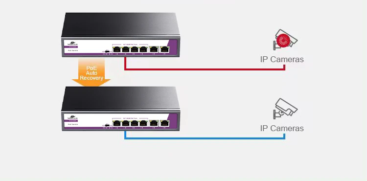 Watchdog PoE stale monitoruje stan połączenia zdalnych hostów. W przypadku wykrycia błędu na zdalnym urządzeniu PoE, przełącznik PoE natychmiast restartuje urządzenie, aby przywrócić je do normalnego działania. System Watchdog świetnie sprawdza się zwłaszcza w celu monitorowania sprzętu sieciowego, znajdującego się w odległej lokalizacji, gdy manualny reset nie jest możliwy.