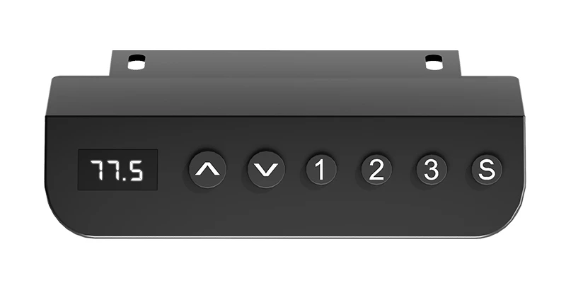 Biurko ergonomiczne Moris posiada wielofunkcyjny kontroler. Reguluj wysokość za pomocą przycisków "góra" oraz "dół" i obserwuj aktualną pozycję na wyświetlaczu LED. Dodatkowo za pomocą opcji zapamiętywania pozycji, możesz z łatwością zaprogramować 3 poziomy wysokości. Po naciśnięciu każdego z 3 przycisków biurko automatycznie zmieni wysokość i samo zatrzyma się po osiągnięciu zapamiętanej wysokości.