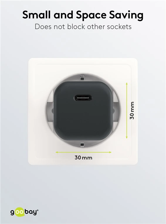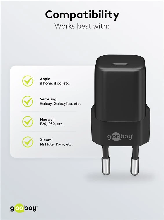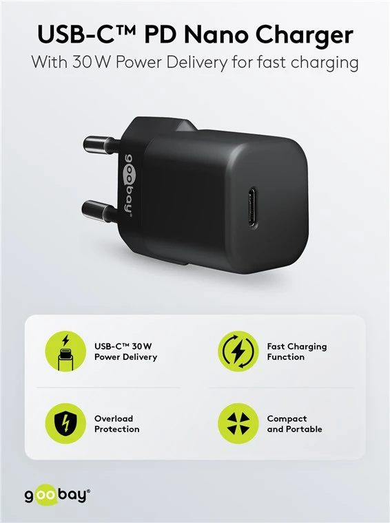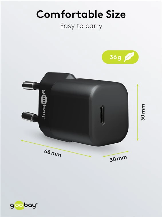 - Ładowarka USB-C nano firmy Goobay jest wyposażona w 1x port USB-C z funkcją Power Delivery,