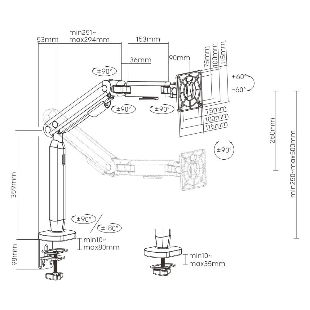 Uchwyt do monitora Spacetronik SPAI110 dopasuje się idealnie do Twoich potrzeb. To wszystko z uwagi na szerokie możliwości regulacyjne. Ramię do monitora daje Ci opcję pochyłu w zakresie +60°~-60° i obrotu +90°~-90°i obrotu ekranu +90°~-90°. Blokada obrotu o 180° zapobiega wsuwaniu się ramienia monitora w ścianę. Dzięki temu z łatwością ustawisz monitor, tak jak chcesz. Maksymalny udźwig uchwytu to 11 kg.