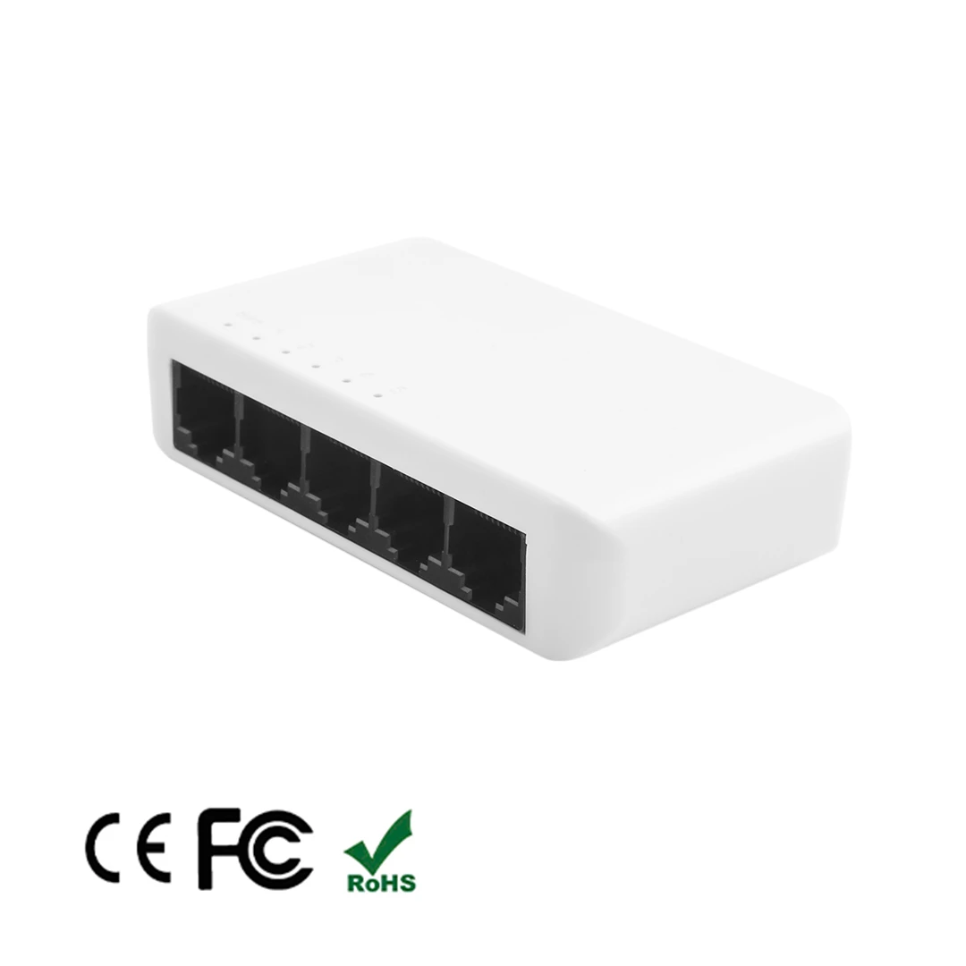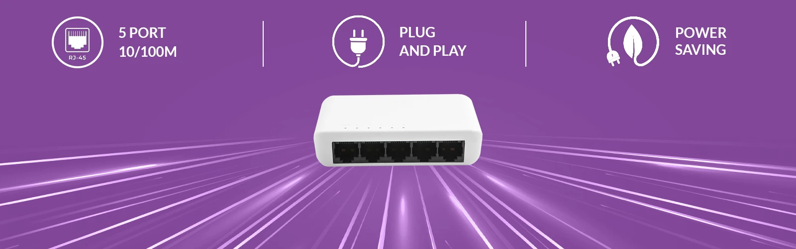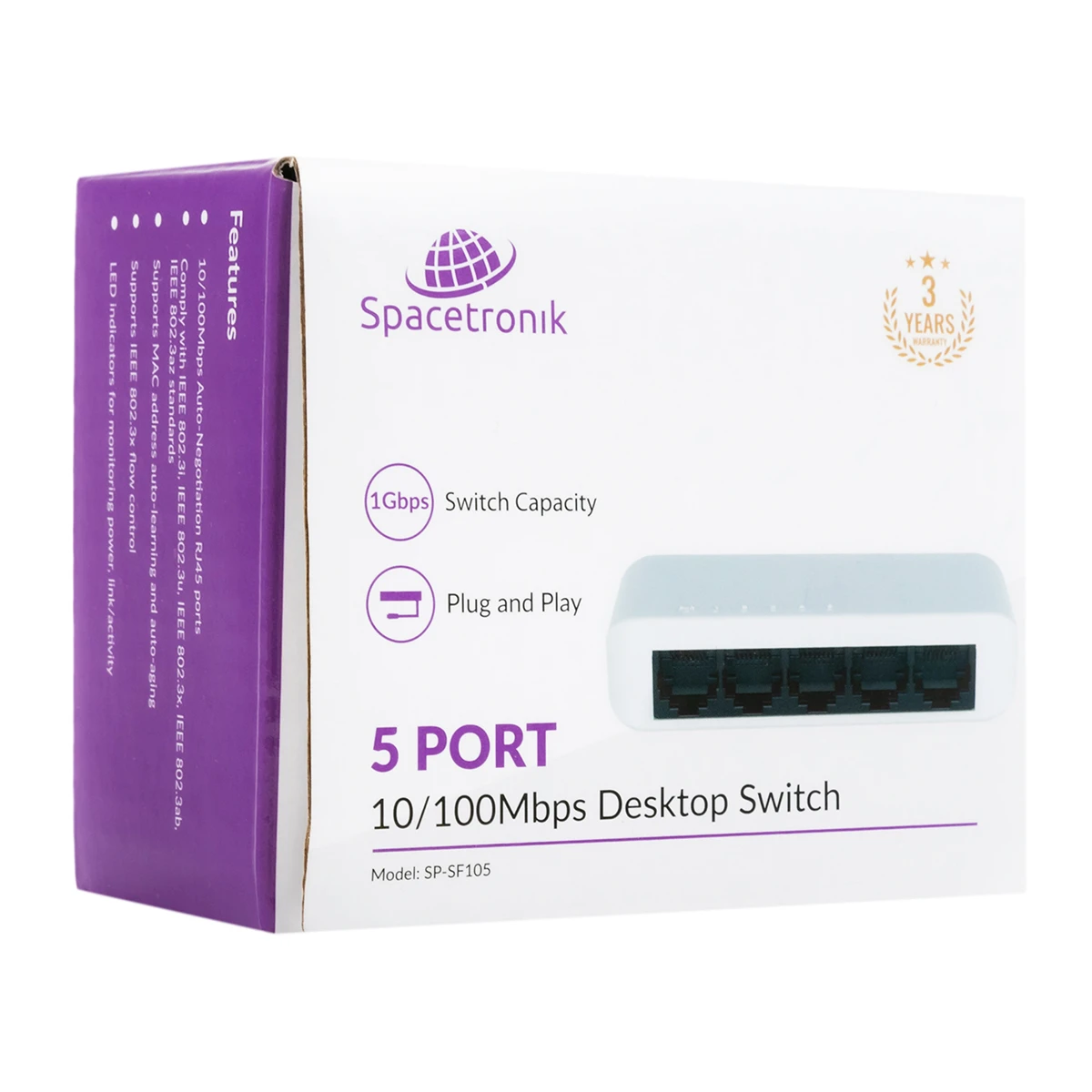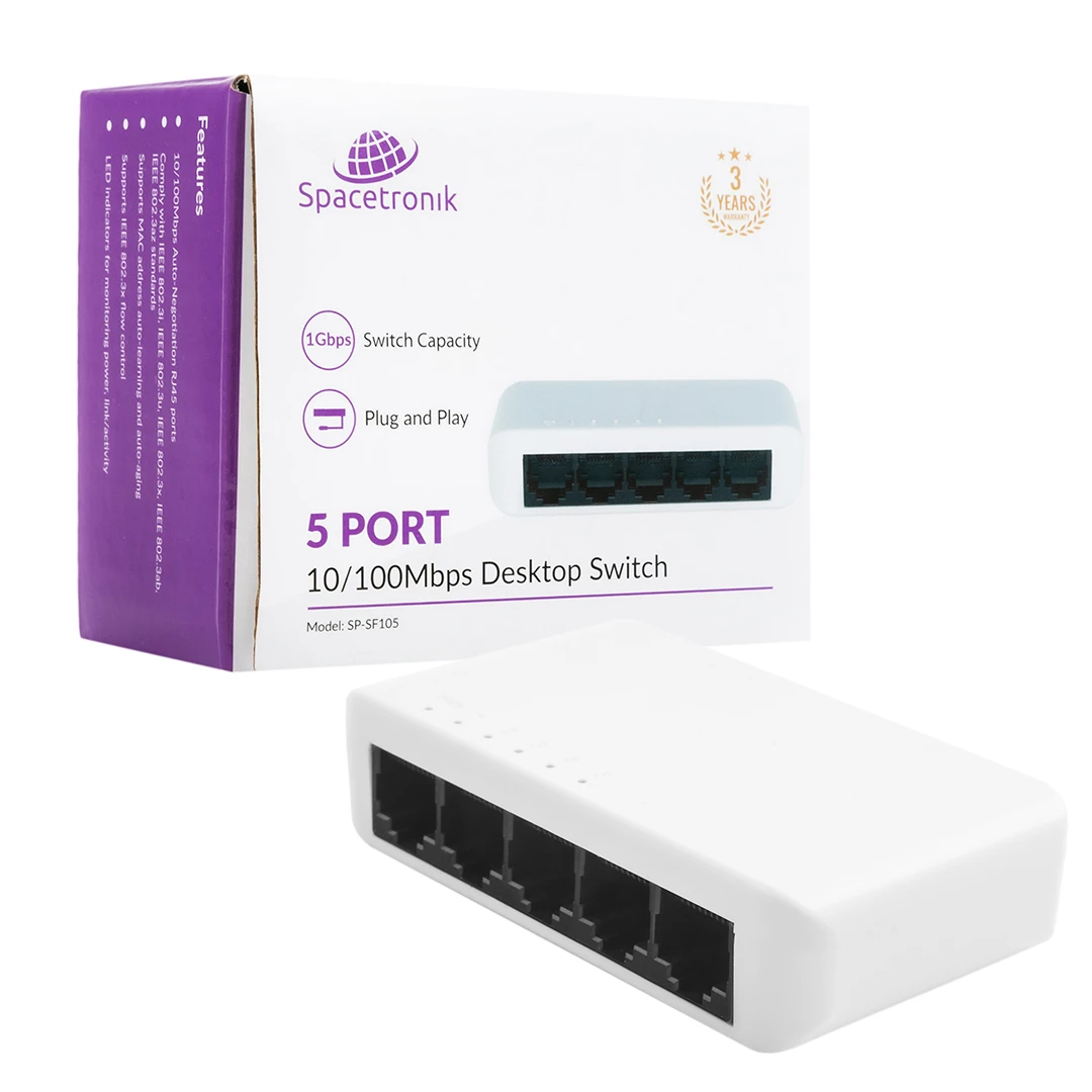 Switch Ethernet Spacetronik SP-SF105 to wydajny i poręczny przełącznik, idealny zarówno do biura, jak i do domu. Oferuje 5 portów 10/100M, które zapewniają szybki i niezawodny przesył danych. Porty RJ-45 z automatyczną negocjacją mogą zapewnić przesyłanie dużych plików, a także być kompatybilne z dowolnymi urządzeniami LAN. Dzięki nieblokującej architekturze przełączania produkt przekazuje i filtruje pakiety z pełną prędkością okablowania, zapewniając maksymalną przepustowość. Łączy praktyczność i solidne wykonanie wraz z niewielkim rozmiarem i estetyczną obudową. Jest to idealny produkt dla eleganckich pomieszczeń biurowych i domowych.