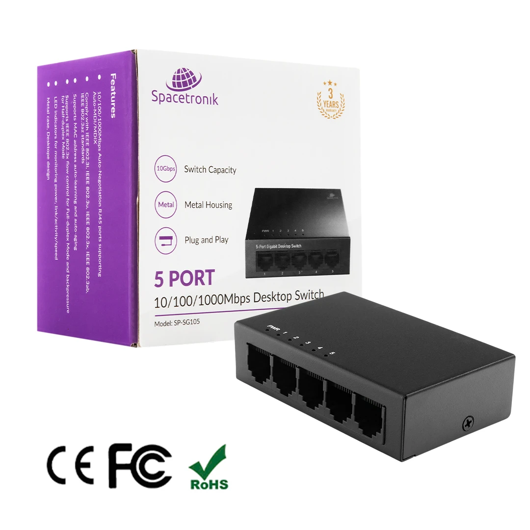 Switch Ethernet Spacetronik SP-SG105 to wydajny i poręczny przełącznik, idealny zarówno do biura, jak i do domu. Oferuje 5 portów 10/100/1000M, które zapewniają szybki i niezawodny przesył danych. Porty RJ-45 z automatyczną negocjacją mogą zapewnić przesyłanie dużych plików, a także być kompatybilne z dowolnymi urządzeniami LAN. Dzięki nieblokującej architekturze przełączania produkt przekazuje i filtruje pakiety z pełną prędkością okablowania, zapewniając maksymalną przepustowość. Łączy praktyczność i solidne wykonanie wraz z niewielkim rozmiarem i estetyczną, wytrzymałą obudową odprowadzającą ciepło. Jest to idealny produkt dla eleganckich pomieszczeń biurowych i domowych.