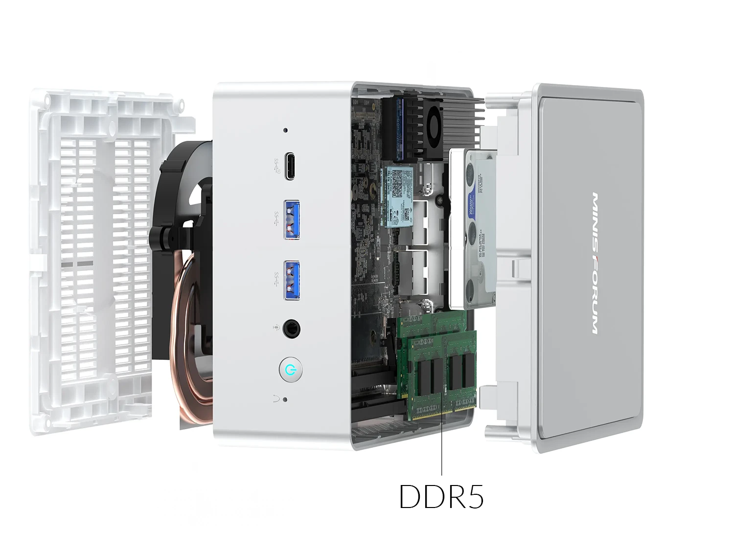 Przenośny komputer Minisforum NPB6 został wyposażony w 16 GB pamięci RAM najnowszej generacji DDR5. To, co przede wszystkim wyróżnia pamięć DDR5 od wcześniejszej wersji ? DDR4 to głównie większa moc taktowania. Pamięć DDR4 występowała najczęściej w wersji o taktowaniu 2133-5333 MHz. Podczas gdy w DDR5 zaczyna się od 4800 i może przekraczać nawet 10000 MHz. Zwiększa to zdecydowanie płynność podczas korzystania z wymagających gier czy też programów. Pamięć DDR5 jest również bardziej stabilna. W zależności od użycia potrafi zapewnić nawet o 13% lepsze osiągi niż pamięć RAM DDR4.