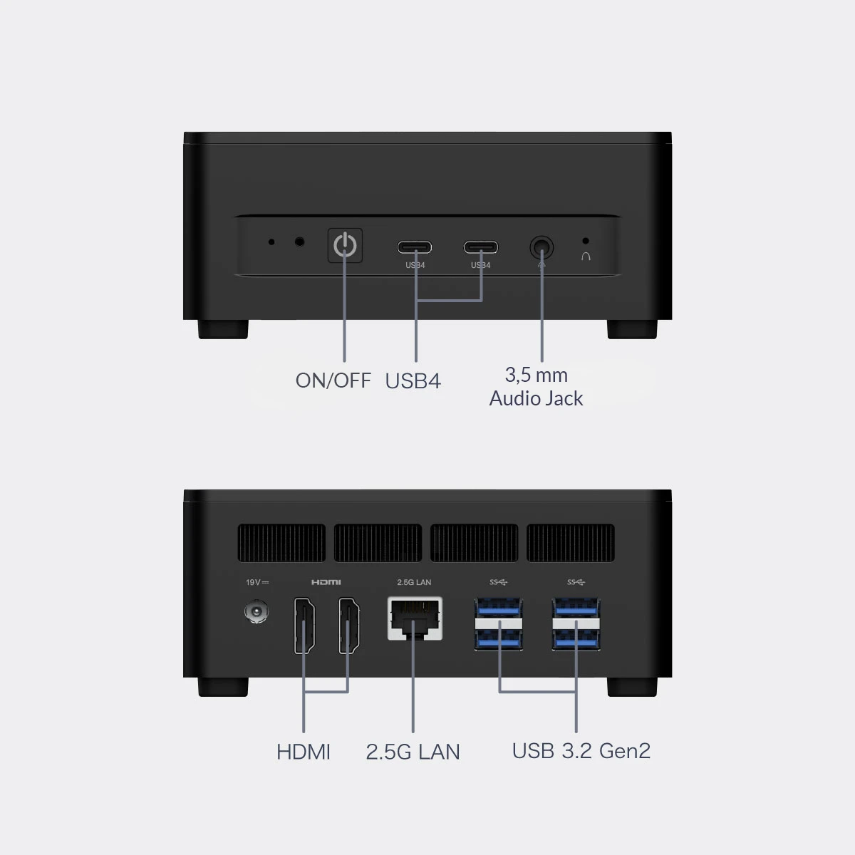 Minikomputer Minisforum UM773 XTX pomimo swojej małej budowy jest urządzeniem bardzo wielofunkcyjnym. Wszystko z uwagi na mnogość portów znajdujących się zarówno z przodu, jak i z tyłu urządzenia. Znajdziesz w nim następujące wejścia / wyjścia: