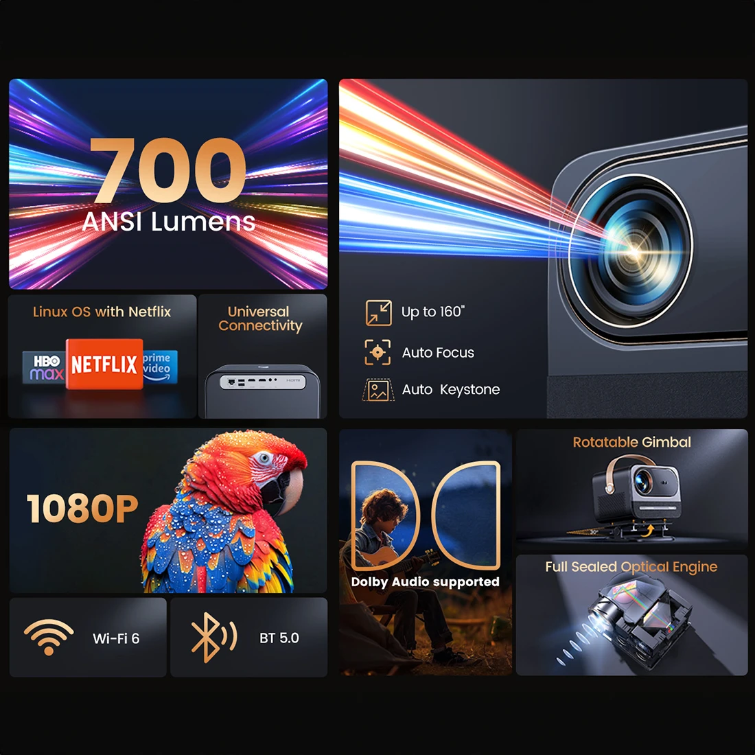 - Regulowana Podstawa i Auto Focus: Dzięki rotacyjnej podstawie i automatycznej regulacji ostrości, ustawienie idealnego kąta projekcji jest szybkie i łatwe.
