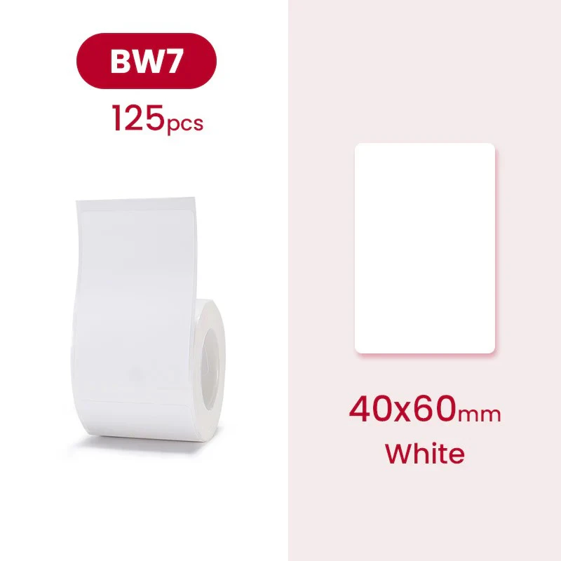 Etykiety do drukarek Niimbot z serii B w kolorze białym. Na rolce znajduje się 125 sztuk w rozmiarze 40x60mm. Etykiety w pozycji wertykalnej (pionowej).