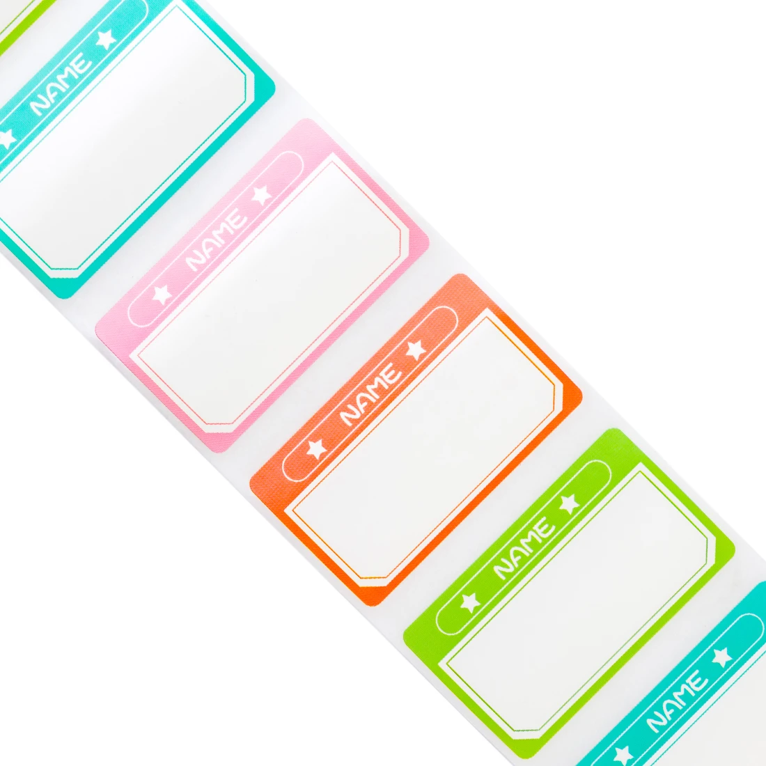 Etykiety wielokolorowe z nagłówkiem "name" do drukarek Niimbot z serii B. Na rolce znajduje się 230 sztuk w rozmiarze 50x30mm. Etykiety w pozycji horyzontalnej (poziomej).