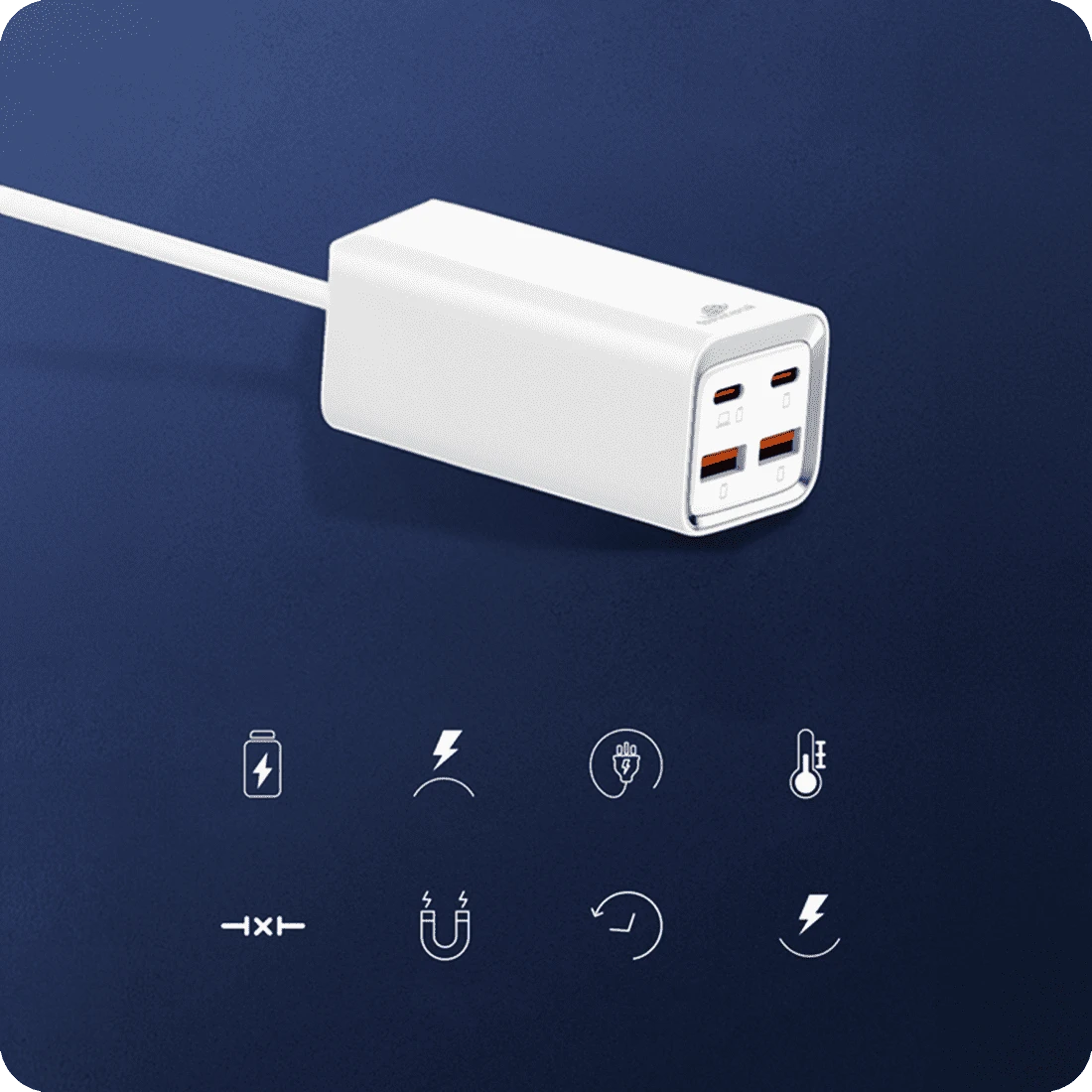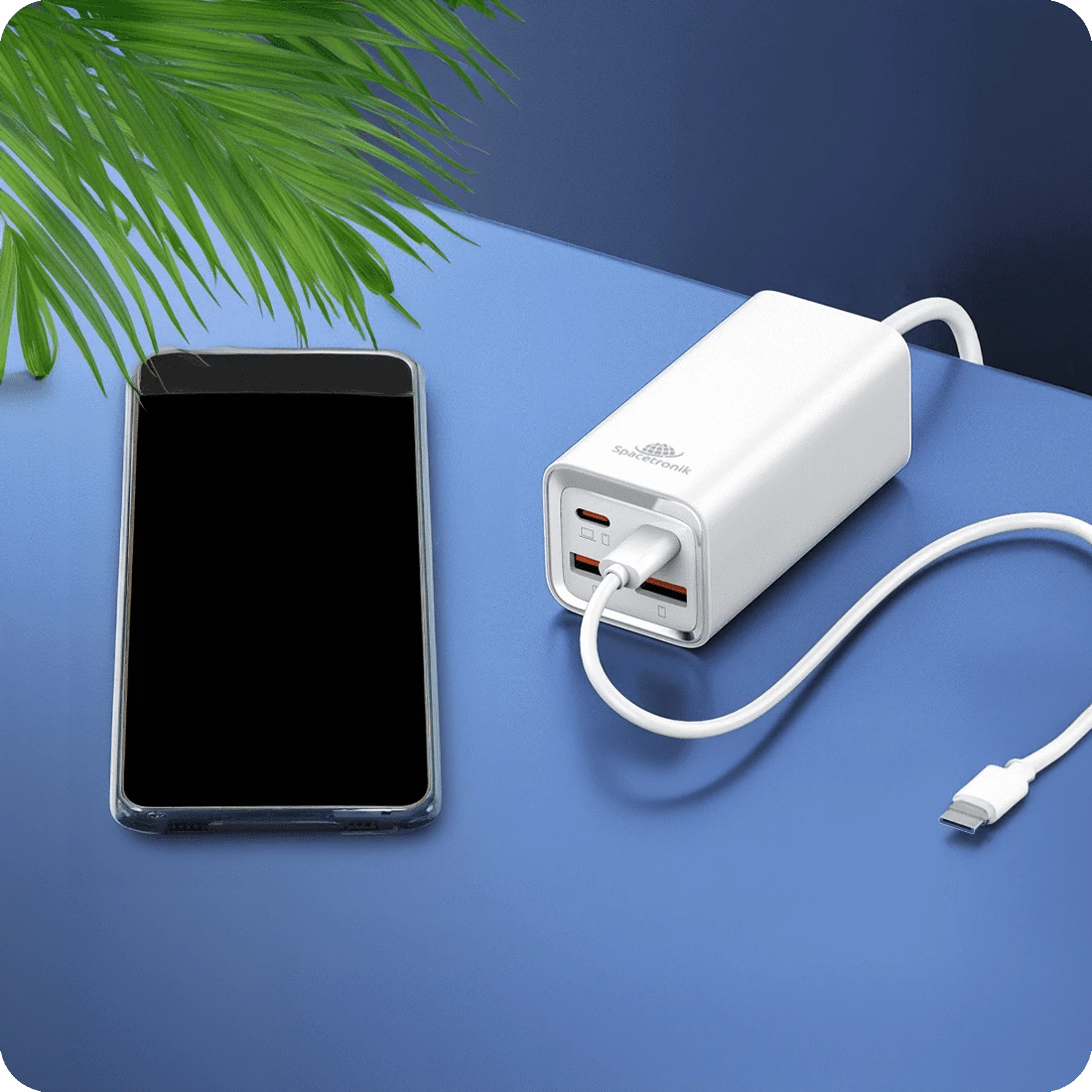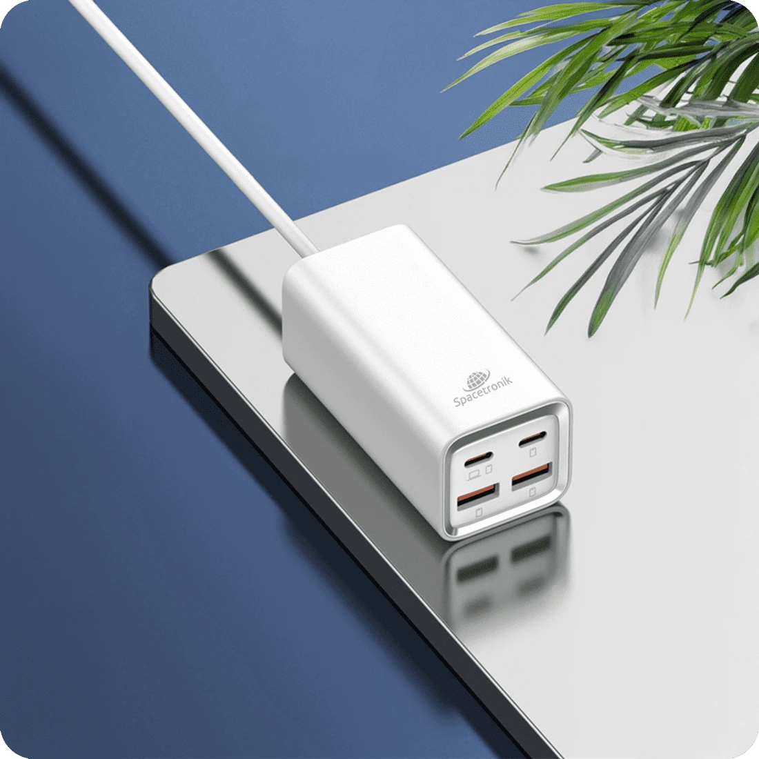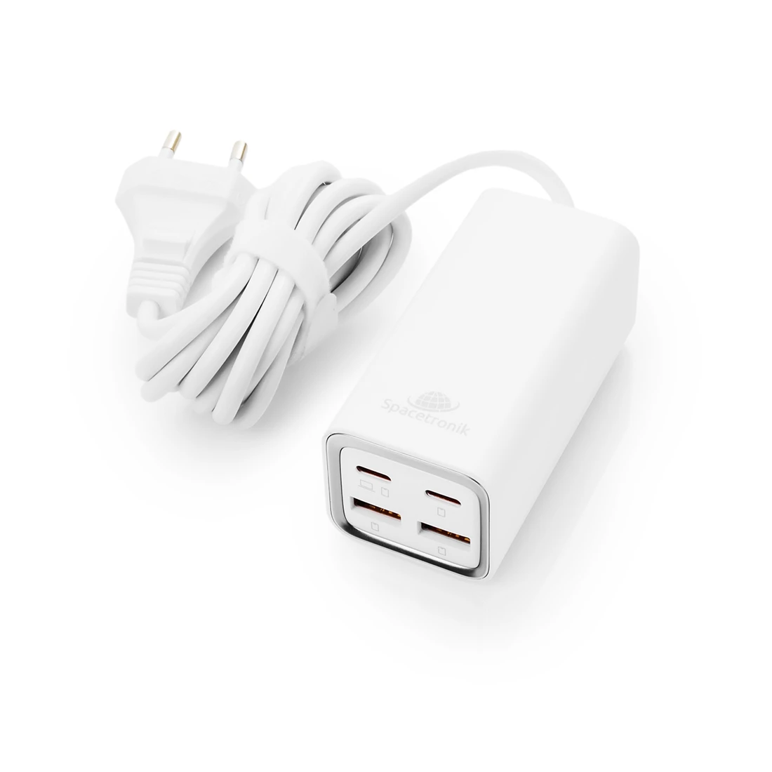 Myśląc o jednoczesnym ładowaniu 4 urządzeń za pomocą jednej ładowarki, możesz obawiać się o prędkość tego procesu. Ze Spacetronik SR102 wszystkie Twoje obawy znikną w mgnieniu oka! Ładowarka została wyposażona w 2 porty USB-C zapewniające moc 65 W. Dodatkowo posiada ona 2 porty USB-A QC3.0 gwarantujące moc 60 W. Są to wystarczająco silne wejścia, by naładować, chociażby Twojego laptopa. Standardowego smartfona naładujesz natomiast za pomocą tej ładowarki w około 30 minut. Dlatego też niezależnie od tego, jakie urządzenie chcesz naładować, nie będziesz musiał się obawiać, że będzie to trwało wieki.
