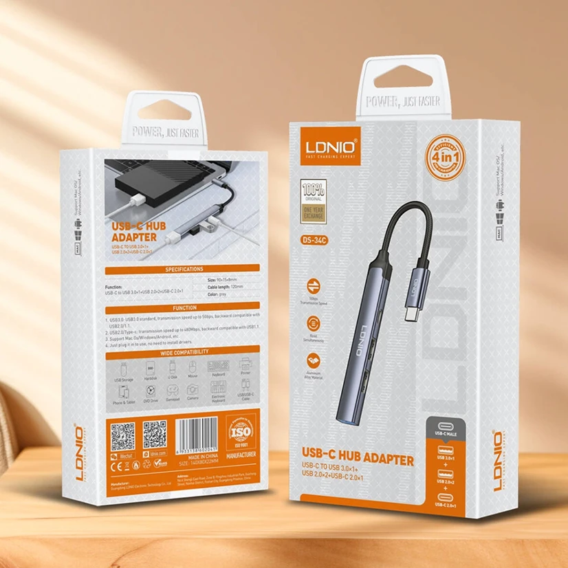 LDNIO DS-34C to kompaktowa stacja dokująca 4 w 1, która doskonale sprawdzi się w codziennym użytkowaniu. Dzięki portom USB-C, USB 3.0 i dwóm USB 2.0, stacja ta jest kompatybilna z szeroką gamą urządzeń i systemów operacyjnych, takich jak Mac OS, Windows i Android. Zapewnia szybki i efektywny transfer danych, eliminując problem niewystarczającej liczby portów w laptopach i innych urządzeniach.