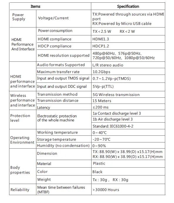 Ten bezprzewodowy transmiter HDMI Miracast zawiera nadajnik i odbiornik, dzięki czemu umożliwia transmisję screen mirroring i przedłużenie sygnału HDMI do 15 metrów bezprzewodowo. Transmiter posiada silne zdolności przeciwzakłóceniowe poprzez działanie z częstotliwością roboczą 5 GHz i obsługuje połączenie punkt-punkt ( 1 nadajnik do 1 odbiornika). Urządzenie idealnie nadaje spotkań, konferencji, rozrywki domowej, edukacji multimedialnej itp. dzięki kompaktowym rozmiarom i przesyłem obrazu bez zakłóceń Możliwość zasilania nadajnika z HDMI (bez dodatkowego kabla USB), choć nie zawsze działa to prawidłowo.