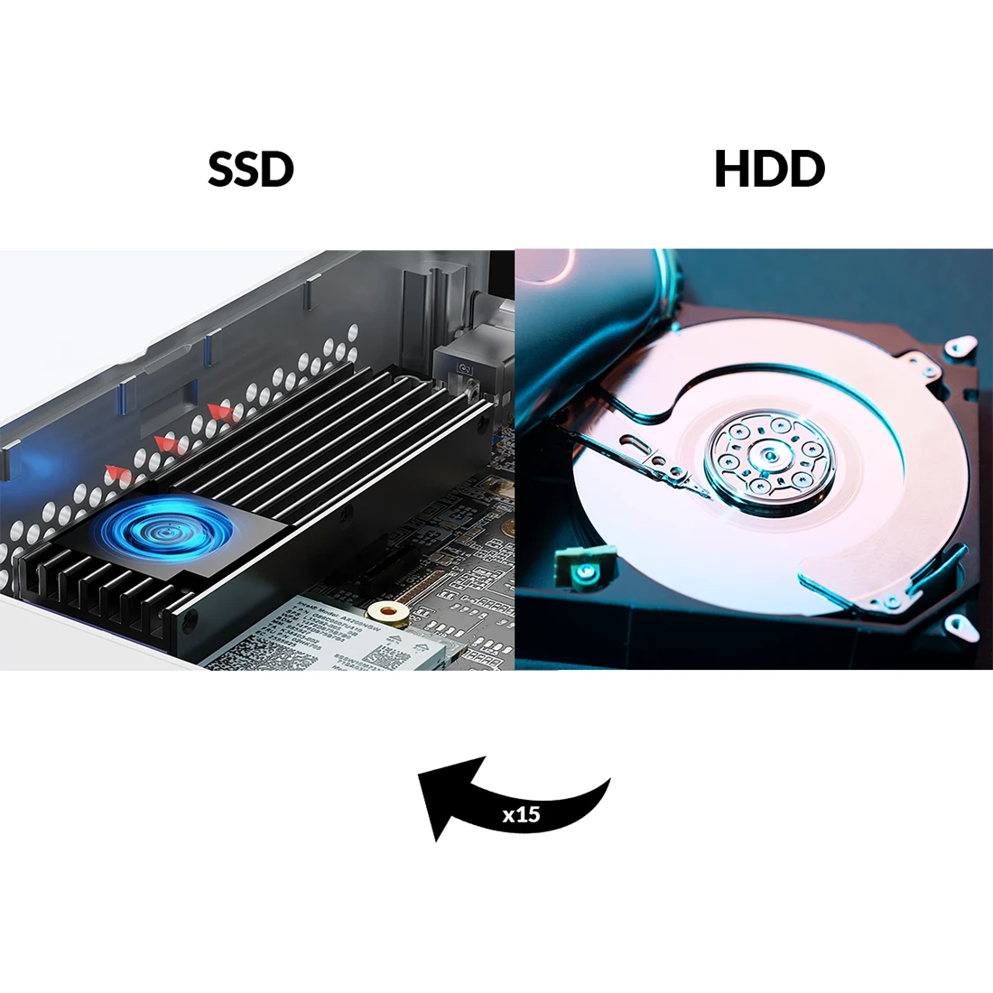 Od lat na rynku toczy się rywalizacja pomiędzy dwoma rodzajami dysków: SSD i HDD. Przez długi czas to dyski HDD były bardziej popularne, jednak aktualnie zmienia się to w kierunku dysków SSD. Wszystko dzięki temu, że dyski SSD są co najmniej 2,5 razy szybsze. Jednak najlepsze dyski SSD mogą być nawet do 100 razy szybsze od tradycyjnych nośników HDD. Co więcej, dyski SSD są zdecydowanie bardziej wytrzymałe na uszkodzenia zarówno mechaniczne, jak i te płynące z różnego rodzaju spięć. Dodatkowo prędkość jego pracy nie jest w żaden sposób zależna od temperatury zewnętrznej. Mały komputer stacjonarny Minisforum UM790 PRO posiada dwa sloty na dysk SSD dających Ci łączną pojemność 1 TB. Mini PC UM790 PRO obsługuje również konfigurację RAID0 i RAID1.