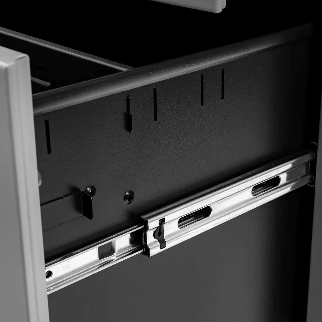 Schludna, dobrze zorganizowana przestrzeń w biurze to absolutna konieczność. Mobilny kontenerek pod biurko to idealne rozwiązanie do przechowywania dokumentów i artykułów biurowych. Wszystko, co potrzebujesz, masz pod ręką. Idealnie nadaje się zarówno do domowego biura, jak i firmy. Szafka jest wykonana z najwyższej jakości stali malowanej proszkowo, co przekłada się na wyjątkową wytrzymałość i stabilność - rozwiązanie na lata. Prosty, nowoczesny design sprawia, że szafka doskonale pasuje do każdego wnętrza. Centralny zamek to gwarancja bezpieczeństwa. Przechowuj dokumenty i wartościowe przedmioty w jednej z dwóch zamkniętych szuflad. Dzięki zintegrowanym kółkom można ją w łatwy sposób przemieszczać. Szafka jest prawie gotowa do użycia, wystarczy, że zamonutujesz kółka (nie potrzebujesz do tego żadnych narzędzi).