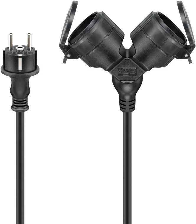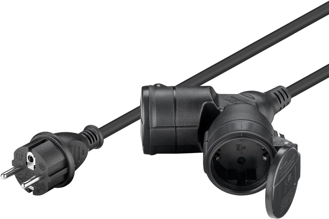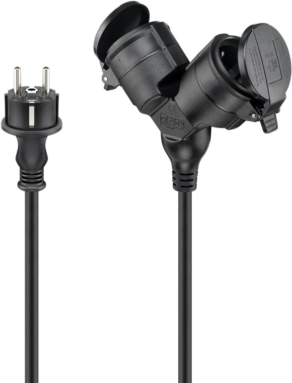 Przedłużacz do zasilania urządzeń gospodarstwa domowego w pomieszczeniach i na zewnątrz oraz do wyposażania bębnów kablowych. Praktyczne rozwiązanie do podwojenia pojedynczego gniazdka. Odporny na zachlapanie zgodnie z stopniem ochrony IP44, odpowiedni do wilgotnych pomieszczeń i tymczasowego użytku na zewnątrz, np. jako kabel zasilający do kosiarek do trawy.