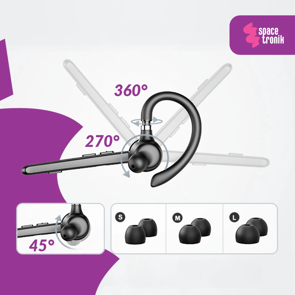 Bezprzewodowy zestaw słuchawkowy Spacetronik SP-HA01 z redukcją szumów to bardzo wygodne urządzenie umożliwiające prowadzenie rozmów bez użycia rąk. Zastosowany chipset Qualcomm QCC3020 zapewnia niezawodne połączenie oraz dźwięk o bardzo wysokiej jakości. Zastosowanie technologii ENC (Environmental Noise Cancellation) skutecznie redukuje hałas otoczenia przez co twoje rozmowy będą zawsze wyraźne. Dzięki pojemnej baterii słuchawka może pracować w trybie rozmów przez 15 godzin. Dodatkowo zestaw wyposażony jest w etui z możliwością ładowania słuchawki o pojemności 500 mAh. Zastosowany standard połączenia bluetooth zezwala na podłączenie jednocześnie 2 urządzeń. Lekka konstrukcja zestawu umożliwia noszenie go przez długi okres czasu bez żadnego dyskomfortu.
