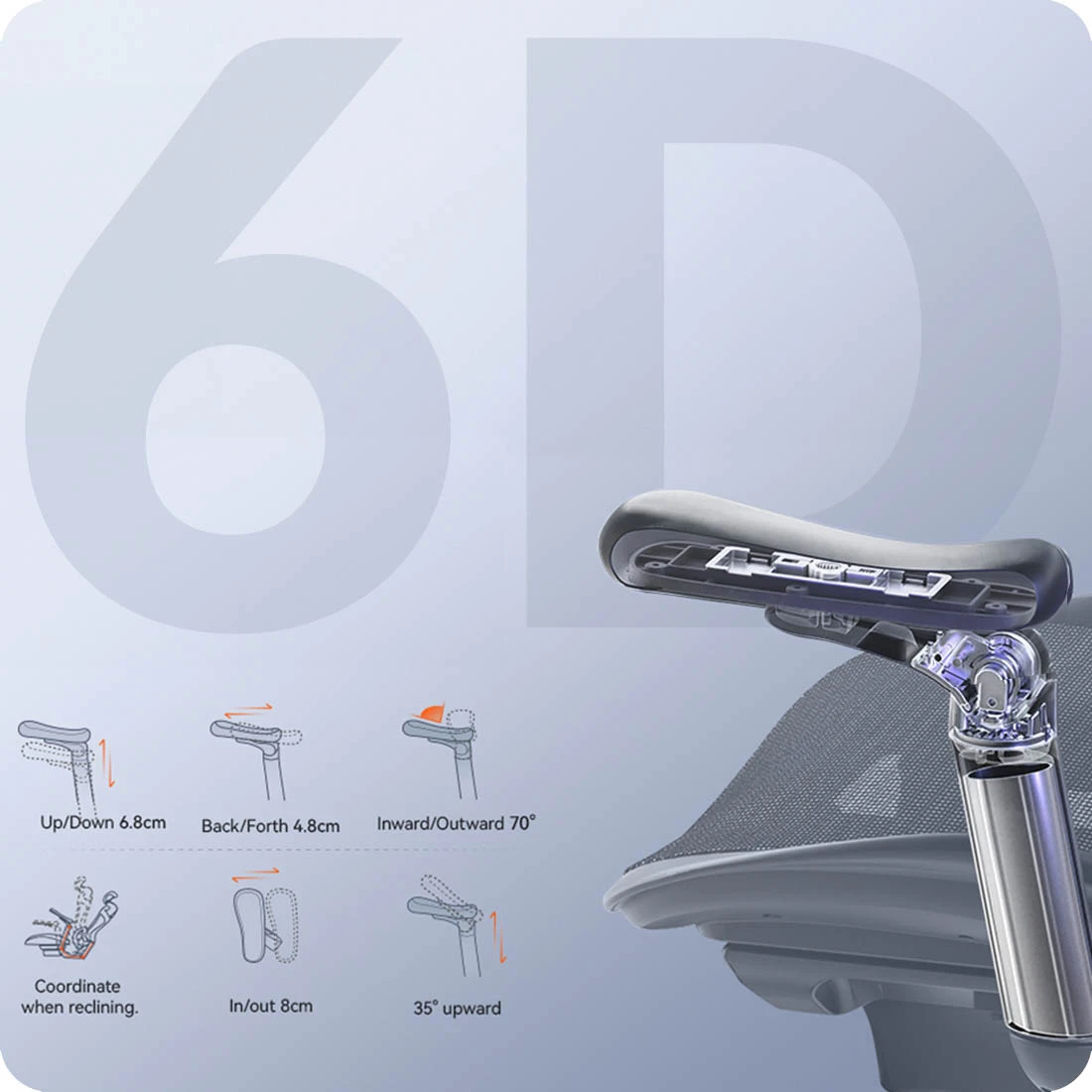 - Podłokietnik: Regulowany 6D (Góra — dół 6,8 cm, przód — tył 4,8 cm, skręt na boki - 70°, zsynchronizowane z oparciem, przesuwanie na boki 8 cm, skręt w pionie 35°),