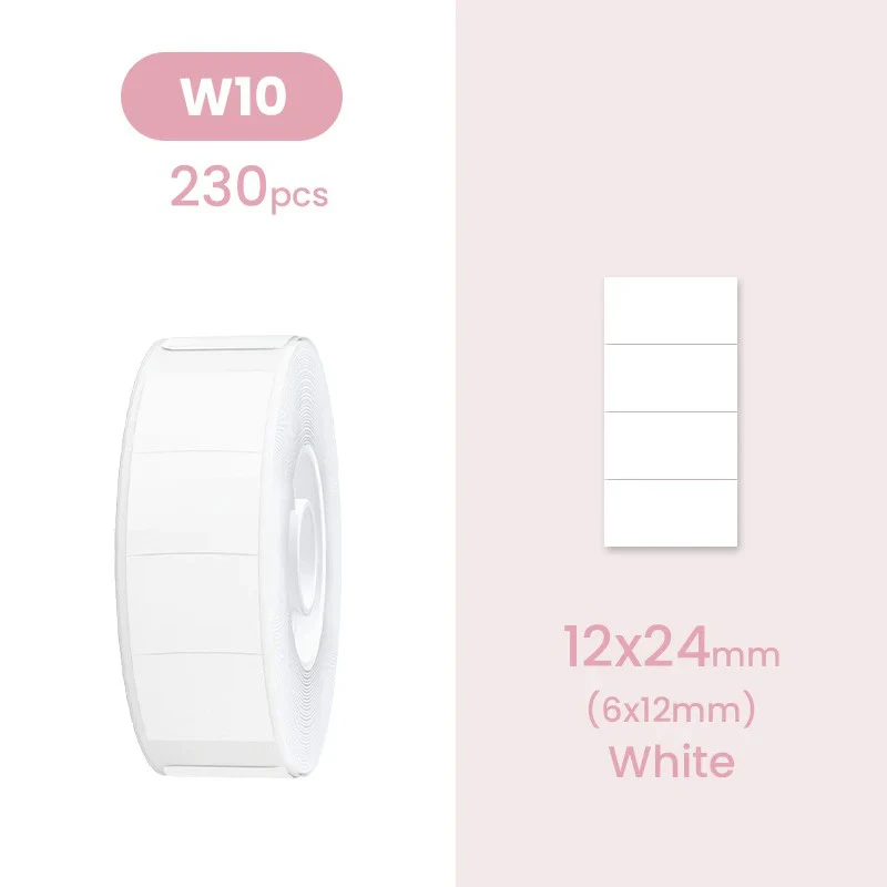 Etykiety do drukarek Niimbot z serii D w kolorze białym. Na rolce znajduje się 230 sztuk w rozmiarze 12x24mm. Etykiety z perforacją co 6mm (wymiar pojedynczy 12x6mm).