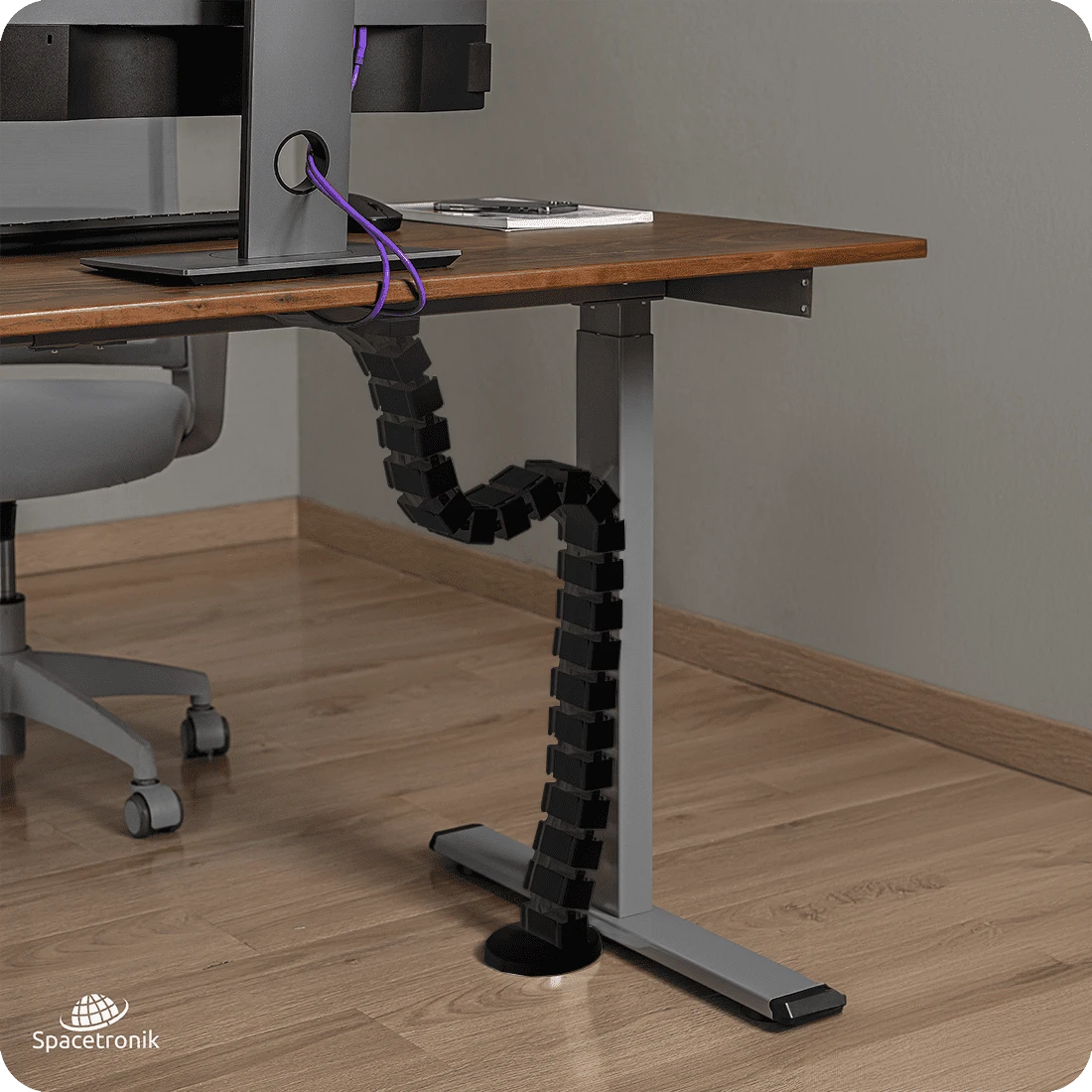 Dzięki wbudowanym magnesom w górnej części kręgosłupa oraz w połowie prowadnicy kablowej możemy ją łatwo przymocować do metalowych elementów. Przykładowo do ramy lub nogi biurka.