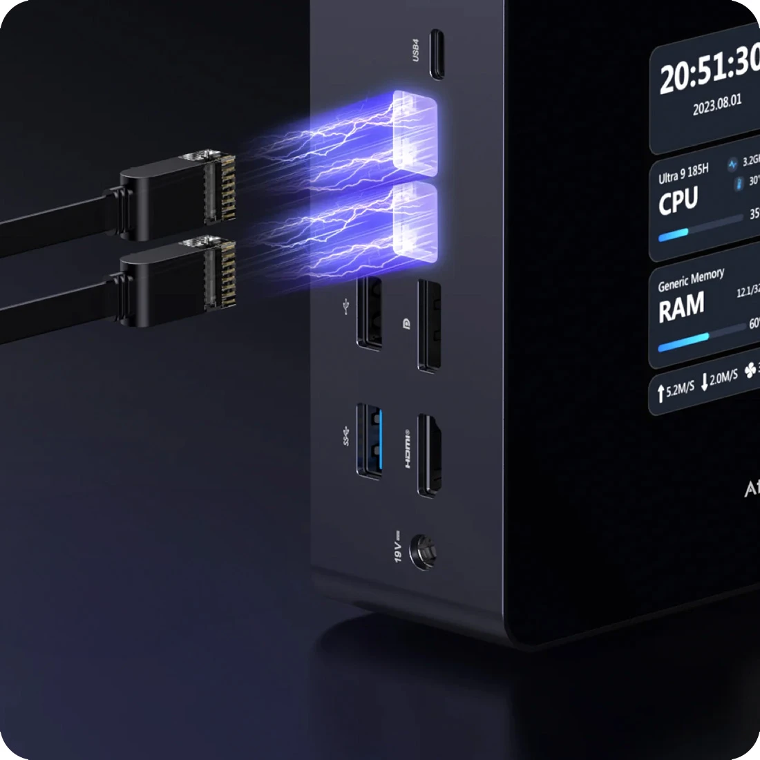 Mini komputer stacjonarny Minisforum AtomMan X7 TI został wyposażony w dynamiczny 4-calowy ekran dotykowy. Jest to innowacyjne rozwiązanie, które ma na celu zapewnienie Ci jeszcze większego komfortu z użytkowania. Za jego pomocą, możesz z łatwością monitorować system, masz możliwość dostosowania mocy komputera czy też zobaczyć godzinę i wybrać motyw.