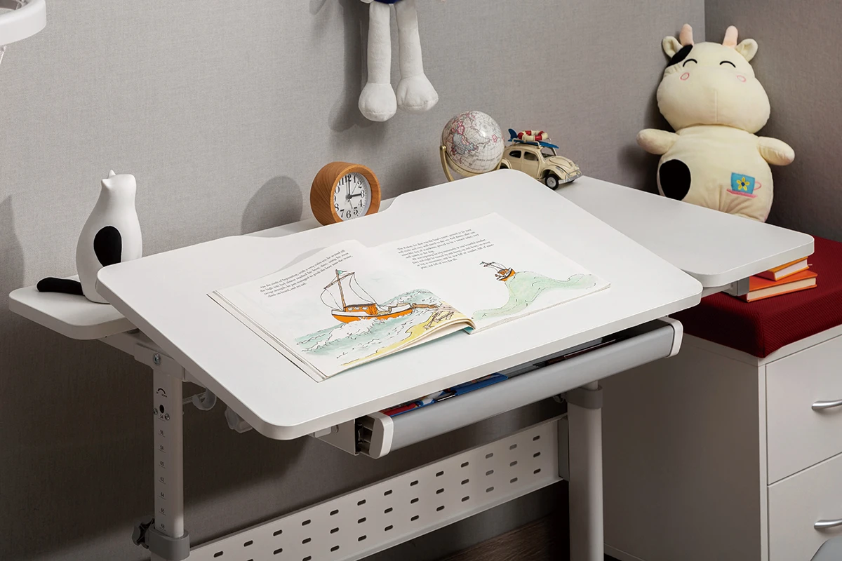 Biurko z regulacją dla dziecka zostało wyposażone w wiele udogodnień, które mają wpływ na komfort użytkowania i bezpieczeństwo.