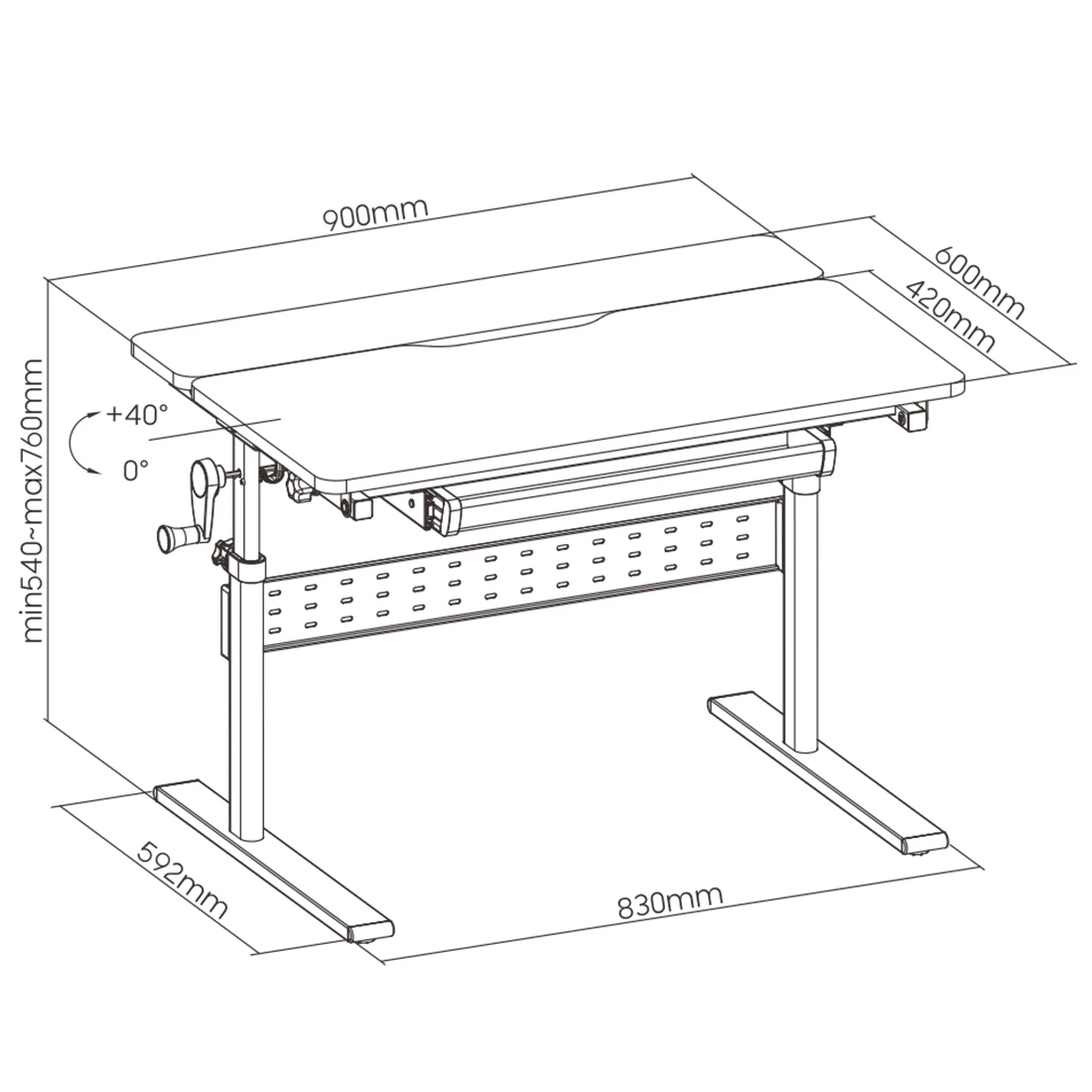 Pochylany pulpit w zakresie 0-40 stopni pozwala osiągnąć ergonomiczne kąty do czytania, pisania i rysowania. Dzięki tej konstrukcji stół może zapewnić wygodne pozycje do pracy i pomaga uniknąć bólu szyi oraz kręgosłupa. Po ustawieniu pochylenia, należy dokręcić pokrętło zabezpieczające, dzięki czemu mamy pewność, że biurko pozostanie w aktualnym ustawieniu.