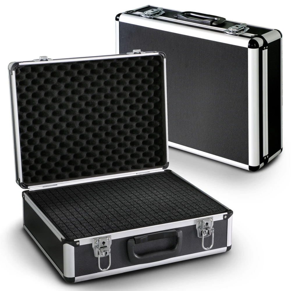 W zamykanym na zamek uniwersalnym futerale można bezpiecznie przechowywać wrażliwe urządzenia elektroniczne podczas podróży i w drodze do pracy. W celu uniwersalnego dopasowania tych wytrzymałych futerałów do danego sprzętu, każdy futerał jest wyściełany wkładką z pianki o grubości 1 cm i dodatkowo wyposażony w dwie wyjmowane sześcienne wkładki z pianki o grubości 3 cm, które można łatwo dopasować bez użycia dodatkowych narzędzi. Dzięki podwójnemu wycięciu w krawędzi zamykającej, te wysokiej jakości walizki oferują wysoki poziom bezpieczeństwa przed wnikaniem pyłu lub rozprysków wody i dlatego są idealnym towarzyszem do codziennej pracy w terenie.