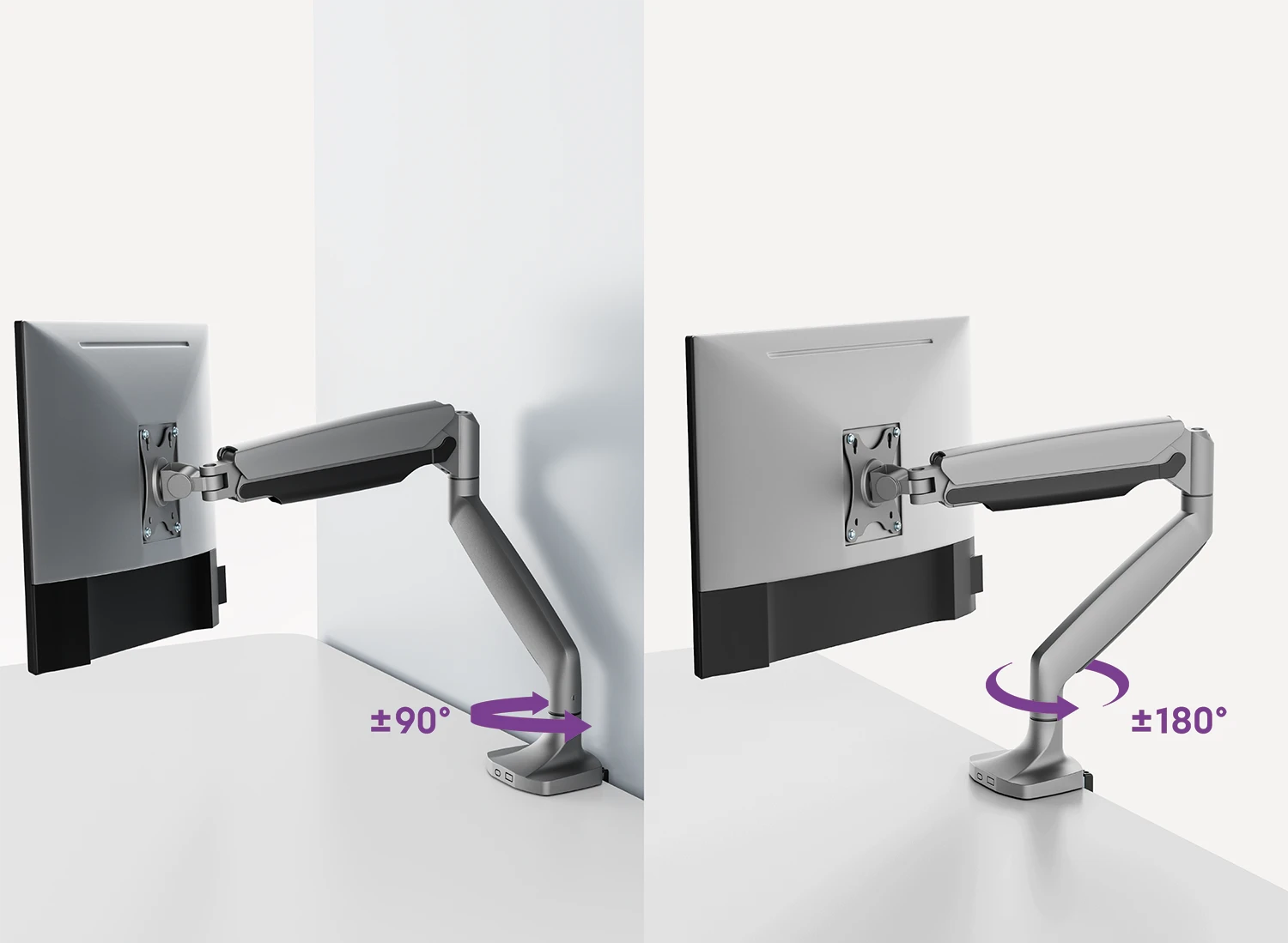 W trosce o Twoje potrzeby, uchwyt do monitora Spacetronik SPA-S110S został zbudowany w sposób dający Ci pełnie kontroli. Możesz sam ustawić pozycję monitora na nim się znajdującego. Masz możliwość zmiany nachylenia (+90°~-90°), obrotu (+90°~-90°) i rotacji (+180°~-180°). Dzięki temu Twój ekran zawsze będzie znajdował się dokładnie w takiej pozycji, jakiej chcesz. Dlatego też, gdy np. będzie oślepiać Cię słońce, możesz bez problemu po prostu zmienić pozycję swojego monitora. Pracuj wygodniej z uchwytem Spacetronik SPA-S110S!
