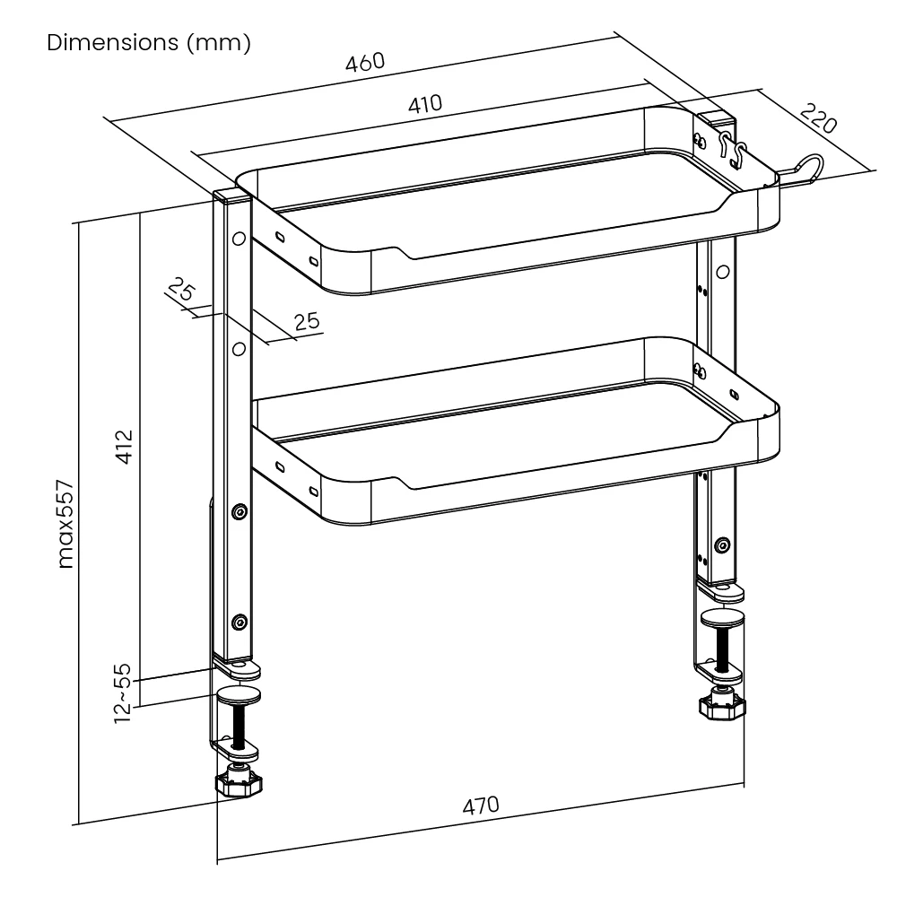 Dzięki solidnemu zaciskowemu systemowi montażu, nadstawkę można pewnie i stabilnie przymocować do blatu biurka. Pasuje do blatów o grubości od 12 do 55 mm, co sprawia, że jest kompatybilna z większością biurek i stołów. To rozwiązanie eliminuje problem przesuwania się półki, gwarantując pewność, że sprzęt i akcesoria pozostaną na swoim miejscu.