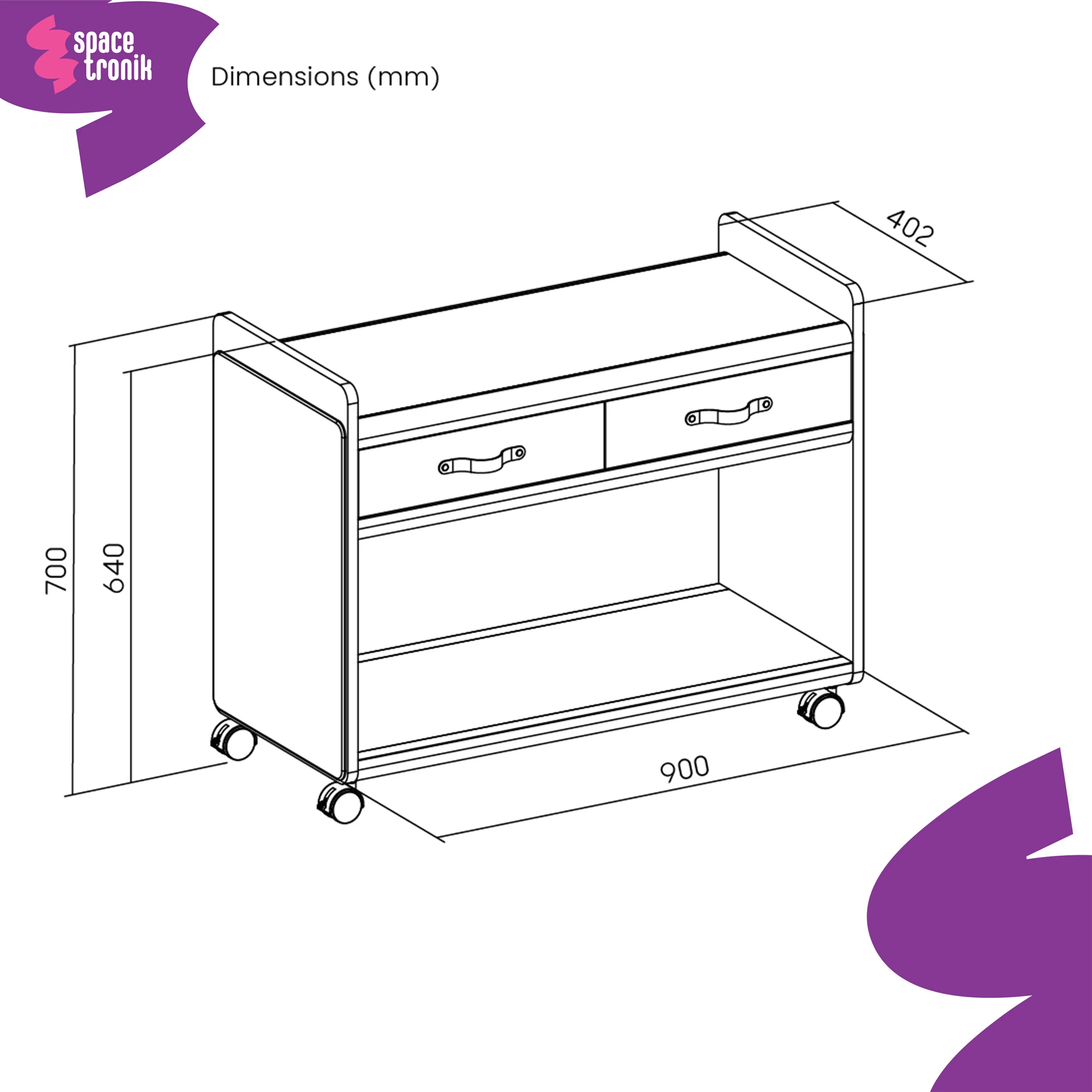 Szafka Spacetronik Frodi, dzięki swojej pojemnej półce i dwóm szufladom znajdzie zastosowanie w wielu różnorakich przestrzeniach. Niezależnie od tego, czy będzie to Twoja sypialnia, biuro czy też magazyn. Ruchome kółka i blat o wymiarach 90×40,2 cm sprawią, że będziesz w stanie wykorzystać szafkę również jako przenośne biurko. Jest wystarczająco duża, by móc bez problemu położyć na niej, chociażby laptopa. Gdy natomiast będziesz czuł potrzebę, będziesz mógł z łatwością razem całą szafką przetransportować się w inne miejsce. Dzięki temu jest to idealne rozwiązanie, chociażby na magazyn lub do dynamicznego nowoczesnego biura.
