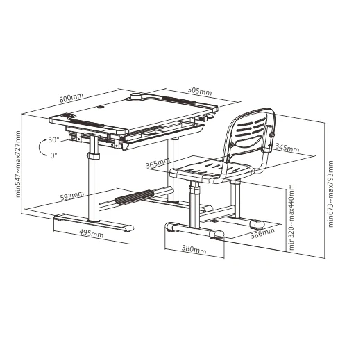 Blat biurka pozwala na wygodne ułożenie wszelkich akcesoriów oraz odpowiednie pochylenie podczas pisania, rysowania czy czytania. Możemy zauważyć, że nasze ciało inaczej układa się przy tych czynnościach - dziecko także zachowuje się w ten sposób. Blaty pochylają się nawet do 30 stopni, co ułatwia uzyskanie dogodnego kąta, podczas różnych aktywności. Dzięki tej funkcji znacząco ułatwiamy zachowanie prawidłowego ułożenia szyi i pleców podczas korzystania z biurka.
