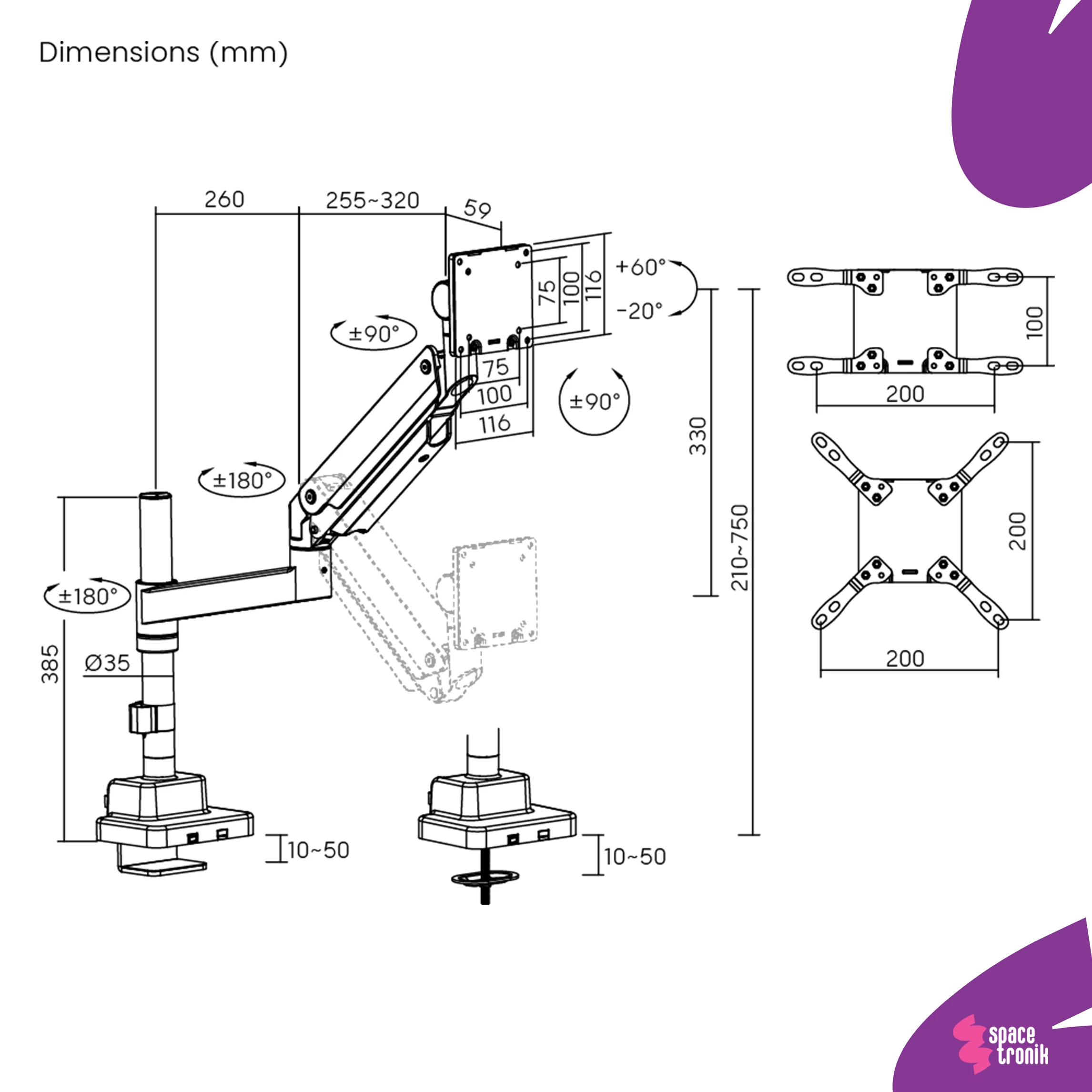 - Standard VESA: 75×75,100×100,100×200,200×100,200×200,